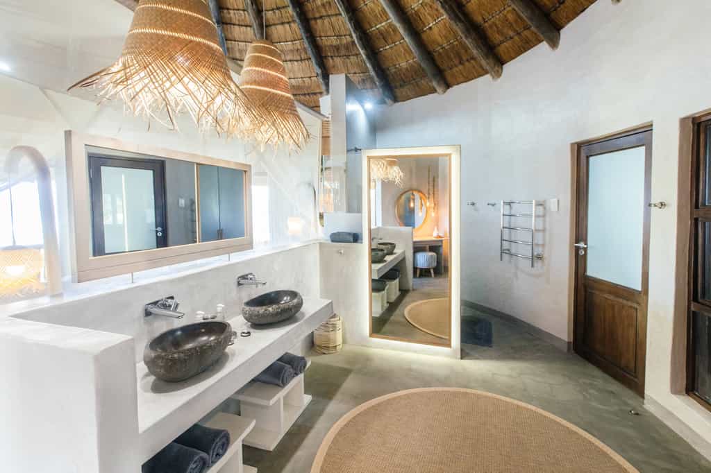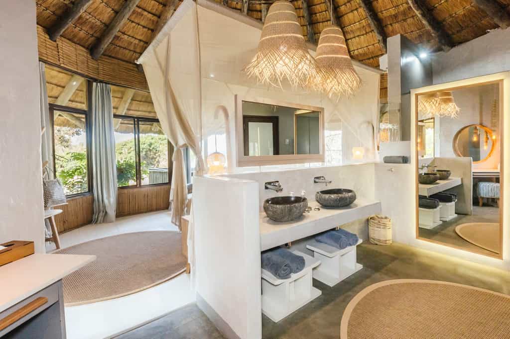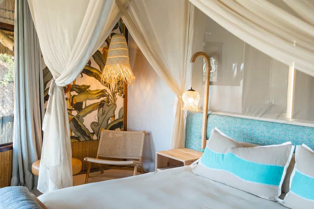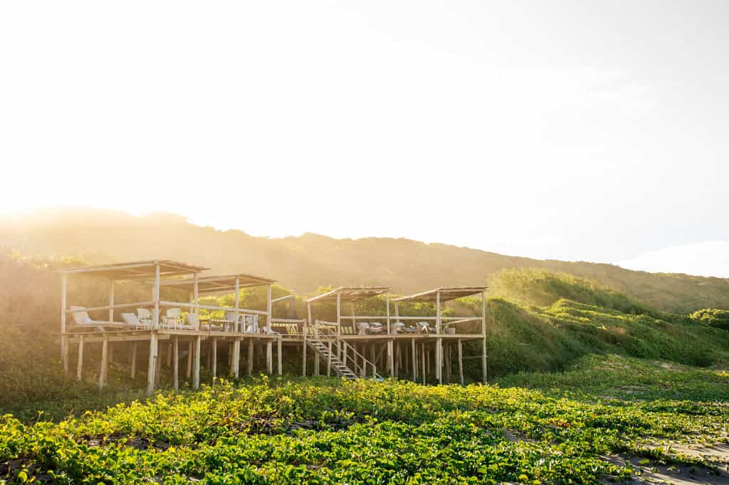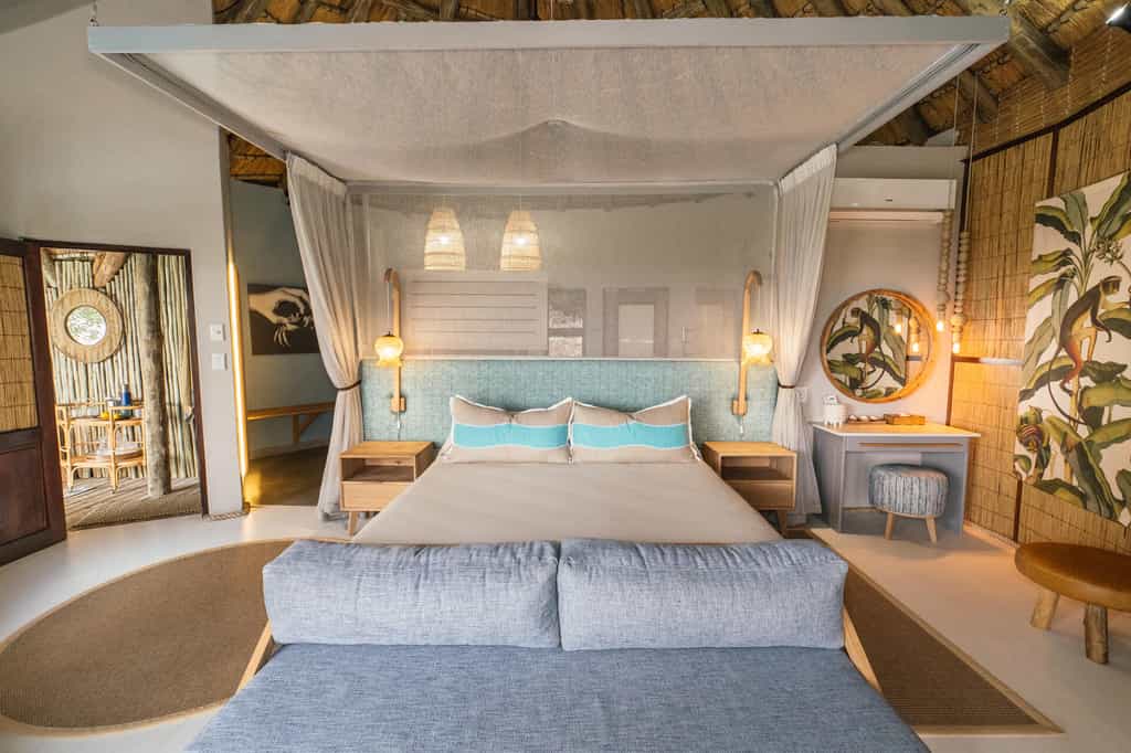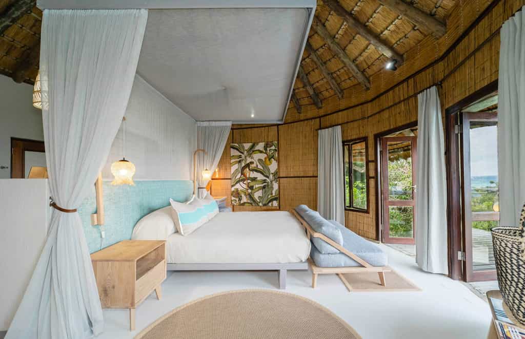 The lodge sleeps 24 in spacious suites of sun-bleached wood and glass hidden in the dune forest and raised on wooden stilts. Each is air conditioned, with a huge bed enclosed in a billowing mosquito net and an en-suite bathroom. Deluxe and family rooms have a massive bath and the Deluxe rooms also have an outdoor shower. Thoughtful extras included golf umbrellas and a small cooler box, as well as dressing gowns. Some rooms offer sea views; others are set within the dune forest. All have private balconies.