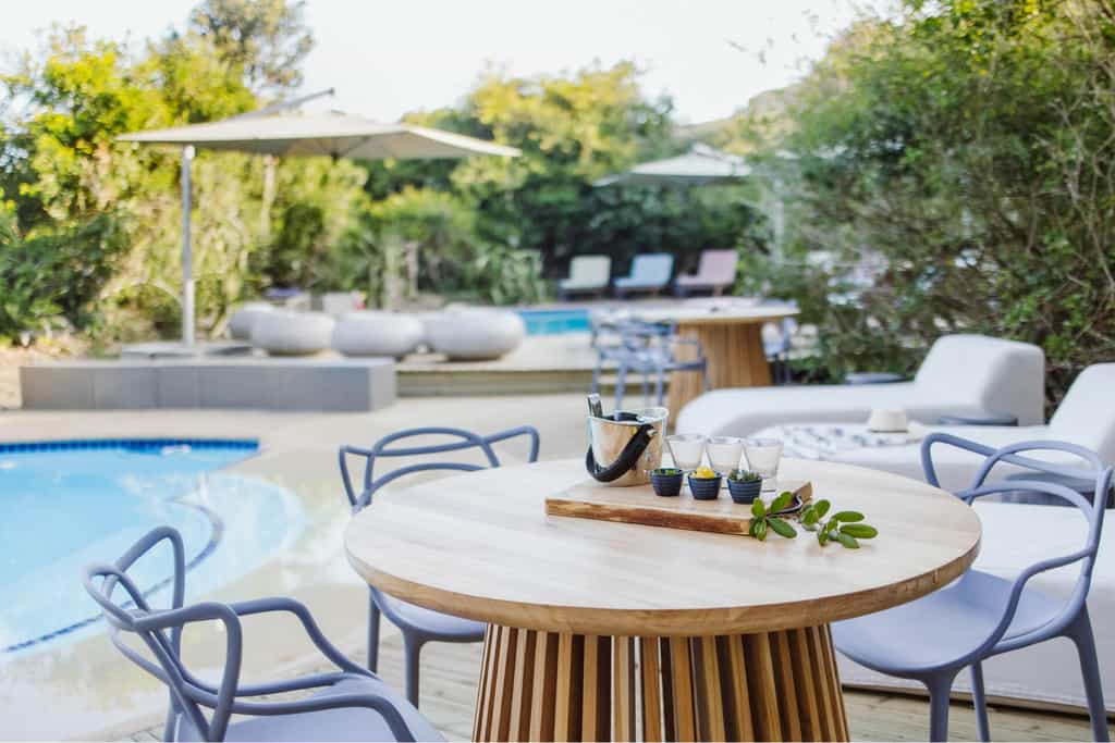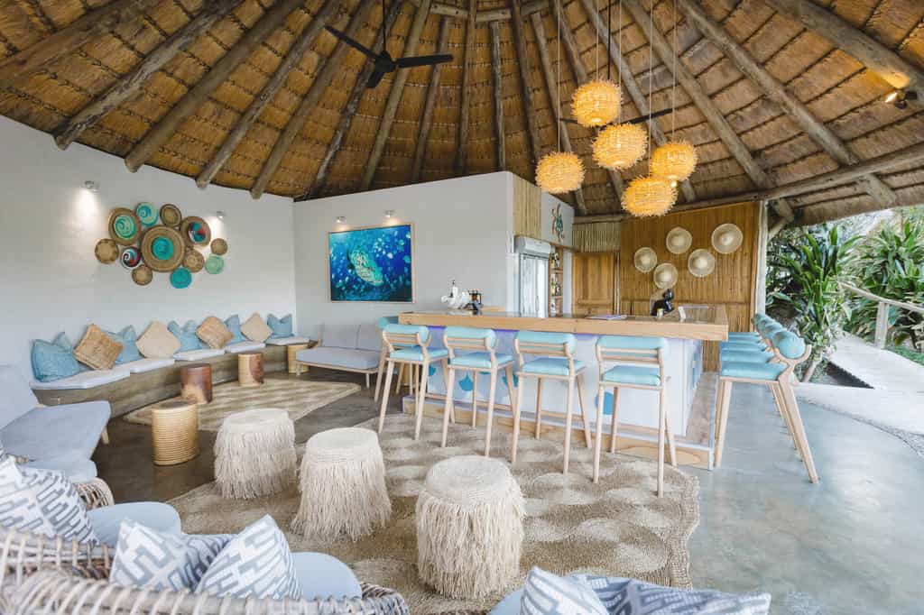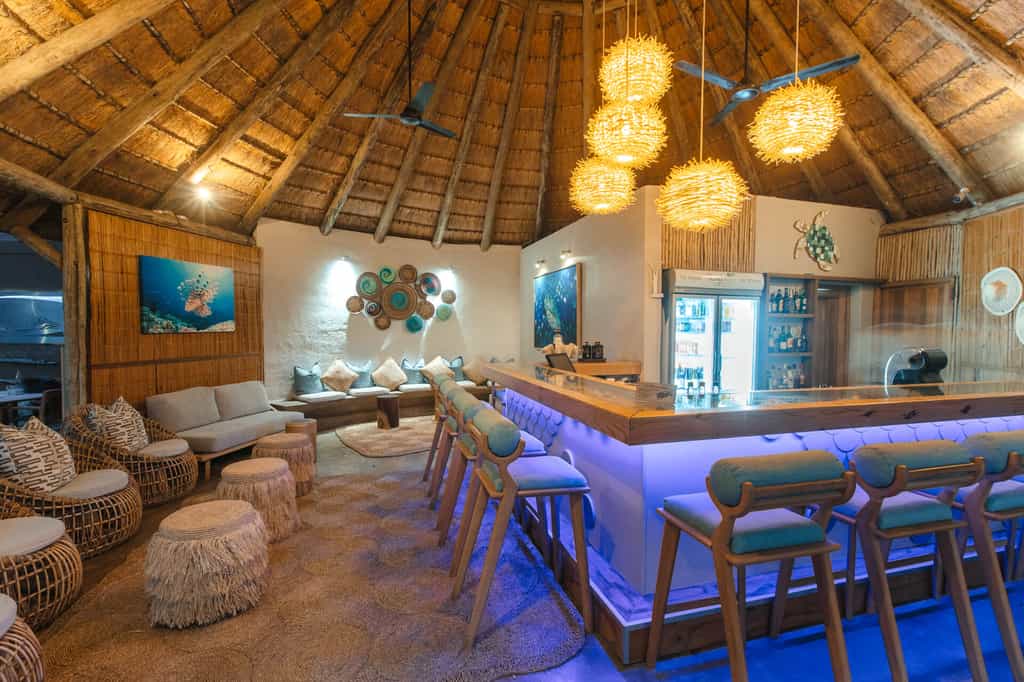 The thatched communal area opens on to a deck, where delicious meals and great wines are served. If you're in a romantic mood, you can dine at a candlelit table on the waves' edge. Near the dining room is the lounge, with big comfortable couches in tranquil seaside colours, a small selection of books and games. Spend hours gazing at the horizon or watching the sun rise over a steaming mug of coffee on the beach deck. There's a pool for hot afternoons, a bar and a spa.