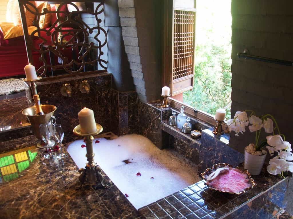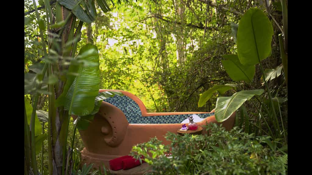 The six fantastic chalets exhibit elements gathered by a lustful wanderer: panels from India, sunken Moroccan beds, in-laid sofas strewn with embroidered pillows, intricately carved four-poster beds, thatch-covered pergolas – each its own intoxicating cocktail. A pair of arched doors open to a private patio where a rim-flow pool and a shady daybed are standard. Inside, deep baths are a central feature and en-suite bathrooms are spacious and luxurious. Outside is a secret shower that's both sneaky and rather romantic...