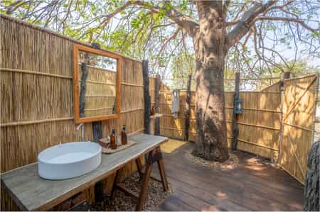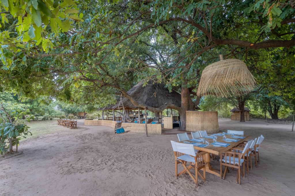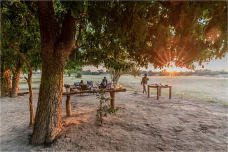 The only part of the camp not on stilts, the main chitenge at Nsolo is a shady refuge from the heat. Hand woven rugs line the wooden floors and safari artefacts of old are dotted around in a contemporary colonial style. Safari chairs, hidden in the shade of the evergreen trees around camp, provide excellent viewing points over the surrounding landscape. Meals are usually served in the cool chitenge or for special occasions, in the riverbed.