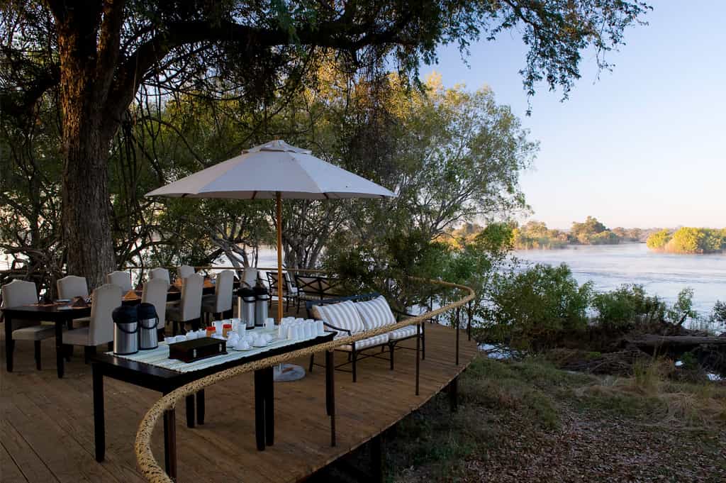 Raised wooden decks are covered with a large canopy of open sided canvas boasting beautifully views of the surrounding bush and river.Hanging chandeliers and neat, natural fabrics lend the entire space an air of simplistic luxury. Built around a large sausage tree, each of the dining, sundeck and lounge areas flow seamlessly together framed by the Zambezi river.Besides the comfy sofa chairs and quaint wooden bar is the infinity swimming pool, perfect for spotting the passing wildlife while catching a tan.