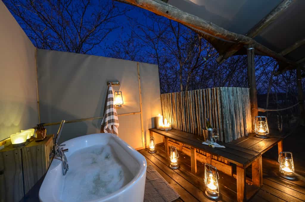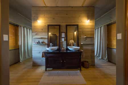 Walkways extend either of the main area out towards twelve spacious safari styled rooms. Glass sliding doors ensure you have the feel of being under canvas. Four-poster beds sit at the centre of the beautifully appointed rooms, stylish leather high chairs and a romantic open-roofed Victorian bath tub. Persian styled rugs and wicker furniture offset the neutral canvas and wooden accents. Most of your time will likely be spent on the sunken decks that show off the splendid views.