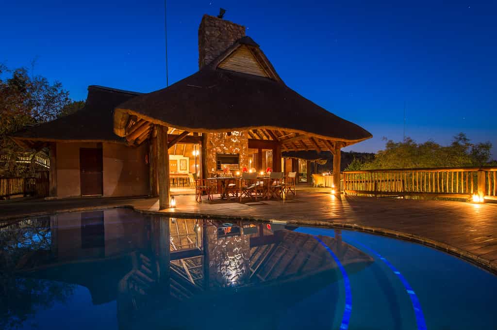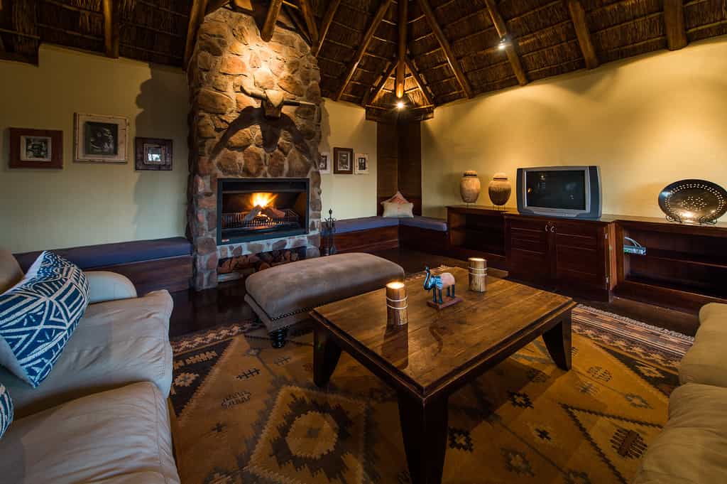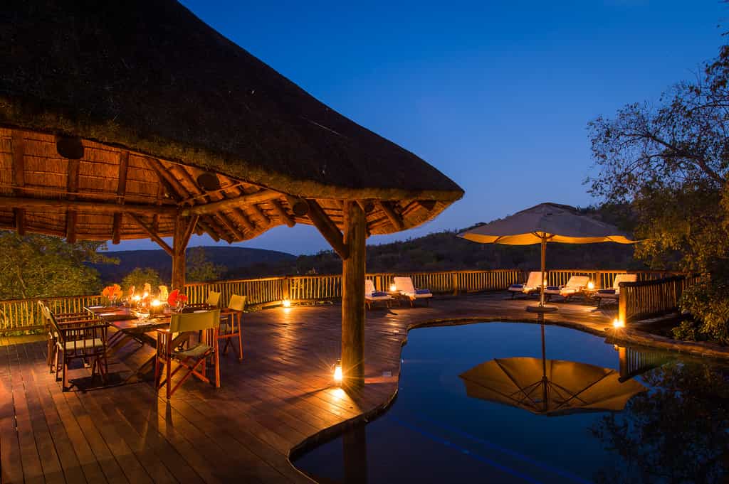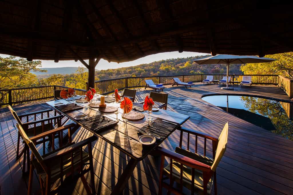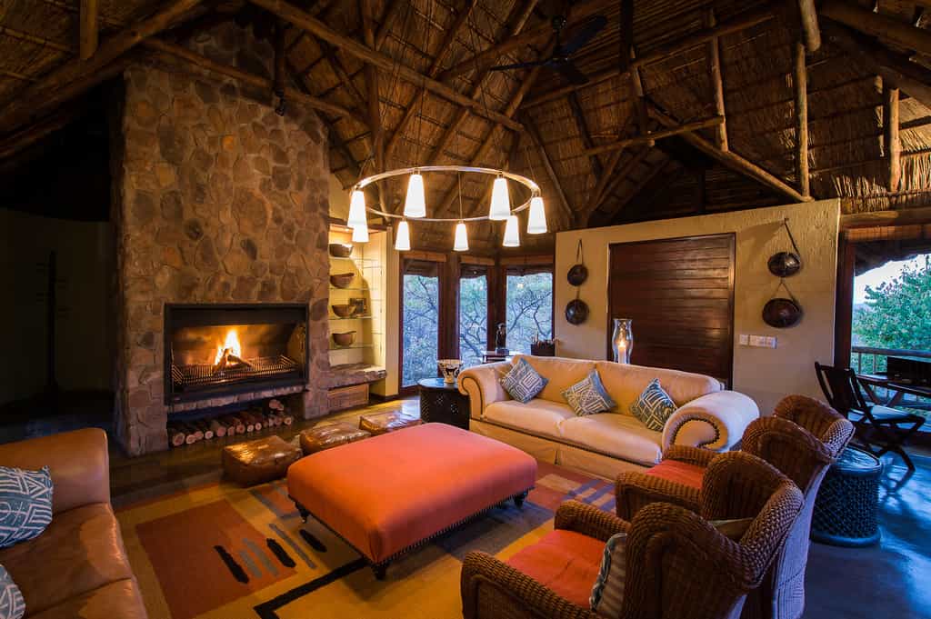 The thatch-roofed, elevated main area, with its sweeping valley views, is surrounded by a wide deck. Inside are a few comfortably furnished lounge areas, and a stone fireplace. Glass sliding doors frame the indoor dining and bar area, lit at night by a rustic wrought-iron chandelier. Meals also take place al fresco on the deck, or in the traditional boma. Midday temperatures can soar, so the clear, hourglass-shaped swimming pool and its wooden deck are the place to be.