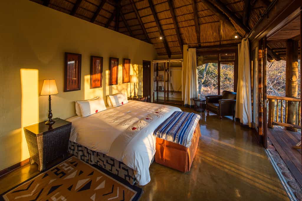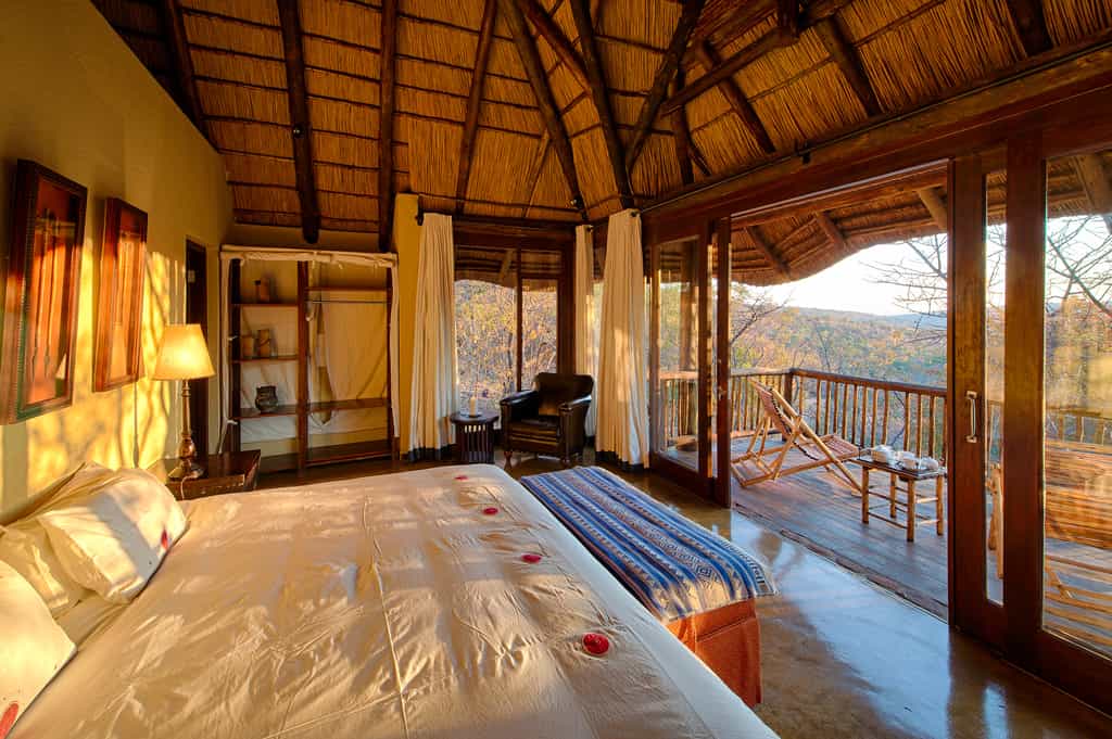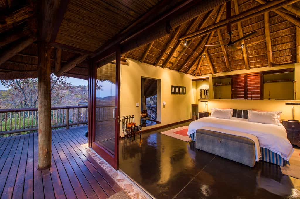 Five well-spaced double rooms have high roofs, and glass doors and windows that allow natural light to flood the interior spaces. Each has a small lounge, a bedroom with a king-sized bed, and a lovely fireplace that’s lit for guests on chilly evenings. En-suite bathrooms have double basins, bathtubs and showers, and glorious outdoor showers with wide sky views. Outside, each unit has a large furnished deck that offers extraordinary views of the landscape and the wildlife it supports.