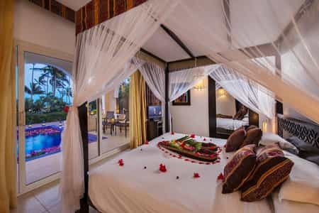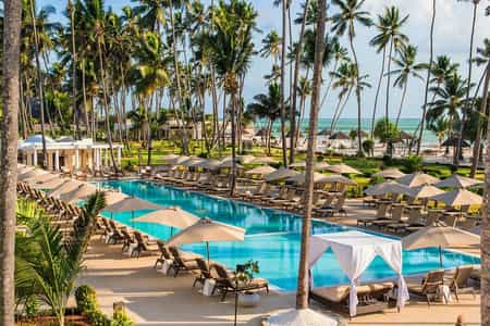 At the Hotel TUI BLUE Bahari Zanzibar , your holiday dream of a tropical paradise will come true. Located directly on the picture-perfect sandy beach and nestled in an exotic garden full of palm trees, this 5-star hotel styled like an Arabian palace is the perfect choice on Zanzibar. Design a comfortable and relaxing beach holiday for two or the whole family completely to your personal taste. The TUI BLUE Bahari Zanzibar entices with several restaurants and bars for feasting. Train with BLUEf!t in front of a dream backdrop, and let your body and senses be pampered in the BLUE Spa. Enjoy the luxurious sweetness of doing nothing at one of the picturesque pools. But you won't want to miss out on the highlights of the spice island of Zanzibar, which you can discover with tips from the BLUE Guides. The TUI BLUE Bahari Zanzibar is also the perfect hotel for a relaxing beach retreat after taking a safari holiday on the mainland.