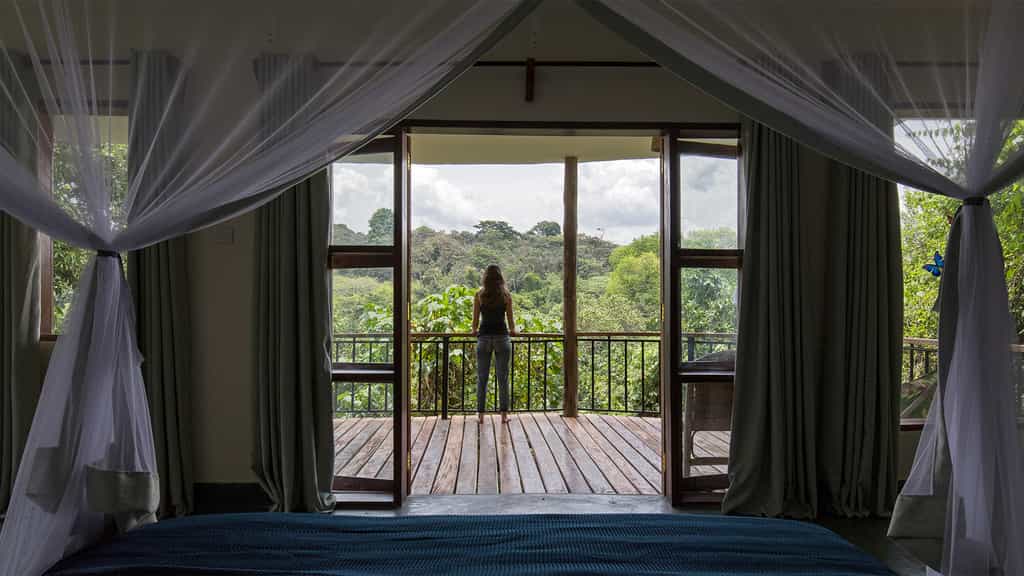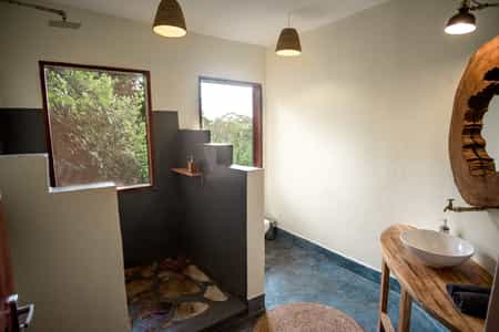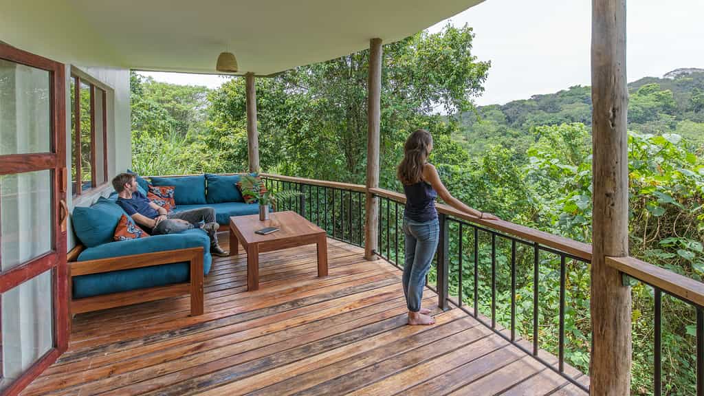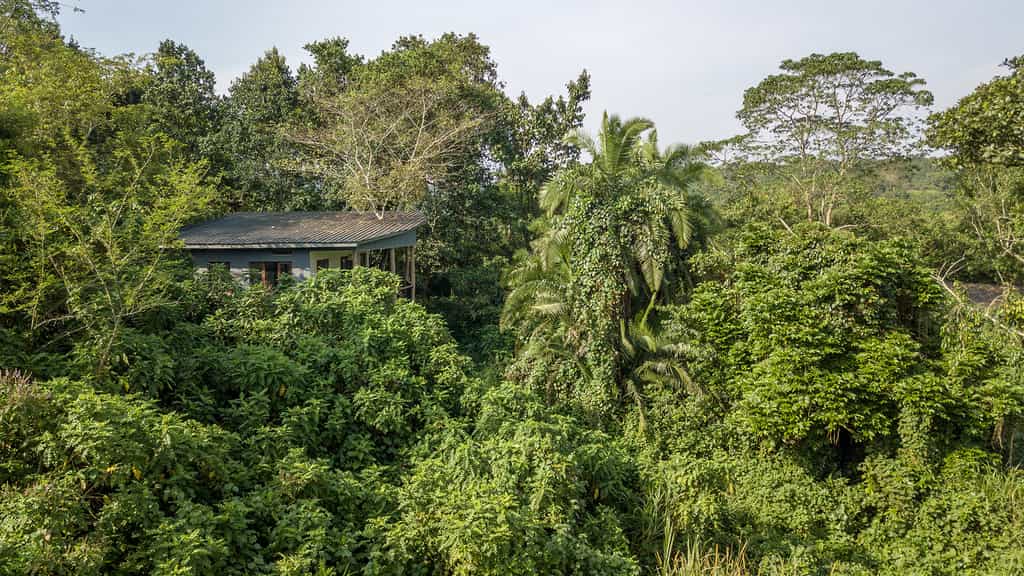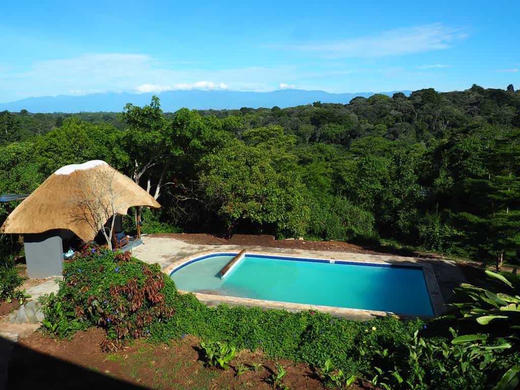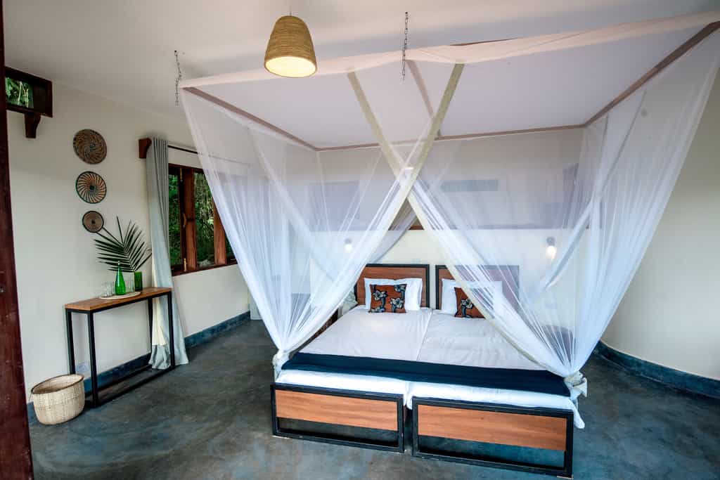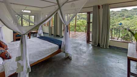 Private chalets in the forest are reached via wooden walkways, along which you're likely to encounter monkeys, bushbabies and birds galore. Each chalet, built on stilts and ringed by a wooden deck, has good views over the canopy toward the spine of mountains. Inside, your creature comforts include a double bed with good mattress, a sitting area, en-suite bathroom with hot shower and flush toilet. Large windows allow plenty of natural light, and a ceiling fan keeps the air flowing.