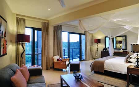 The main area of this lodge lies within a multilevel stone, wood and thatch structure with expansive decks and rolling views of the Victoria Falls National Park. The welcoming staff and spontaneous splashes of colour make for a welcoming ambience that can't be beat in Victoria Falls town. The lounging spaces have an eclectic mix of comfortable furniture adorned with puffy African print pillows. The dining area spills from inside onto the decking and is relatively simple with a modern feel. Victoria Falls Safari Club's sister camp lies a two minute walk away, with welcoming swimming pool is worth the walk.