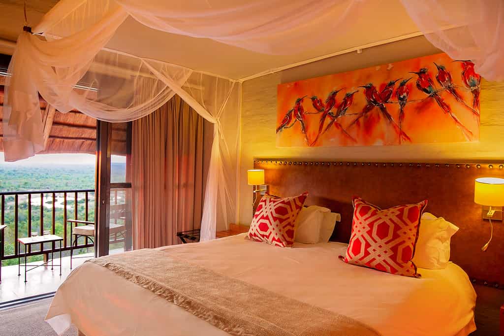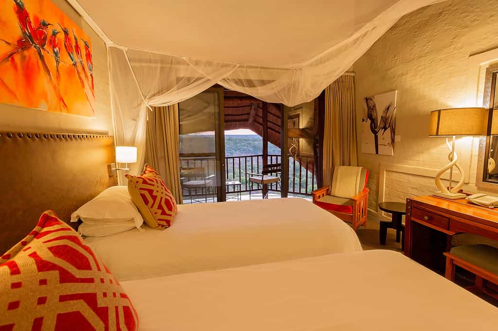 There are 72 air-conditioned rooms with en-suite bathrooms, spacious interiors and sliding glass doors that open onto a private balcony and views of the park, bushveld and sunsets so bright you could watch them forever. Some rooms and six suites overlook the waterhole, which make them a hot choice. The furnishings are subtly stylish in soft earthy colours, the mosquito-netted beds are extra length, the wi-fi is free and many rooms have large, eco-friendly rainfall showers (the Lodge Suites also have bathtubs).