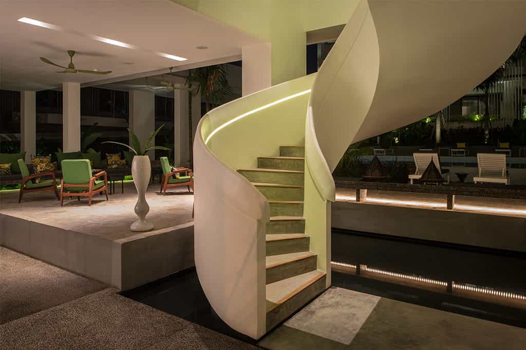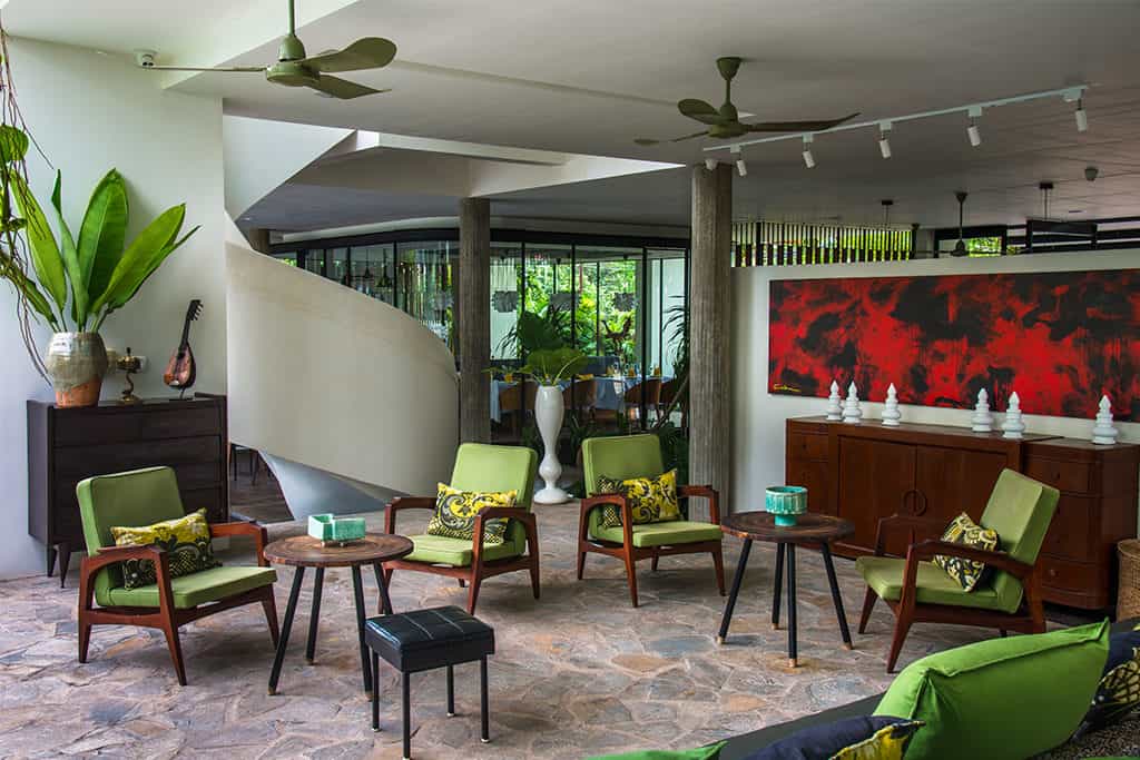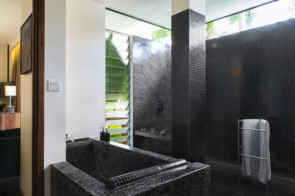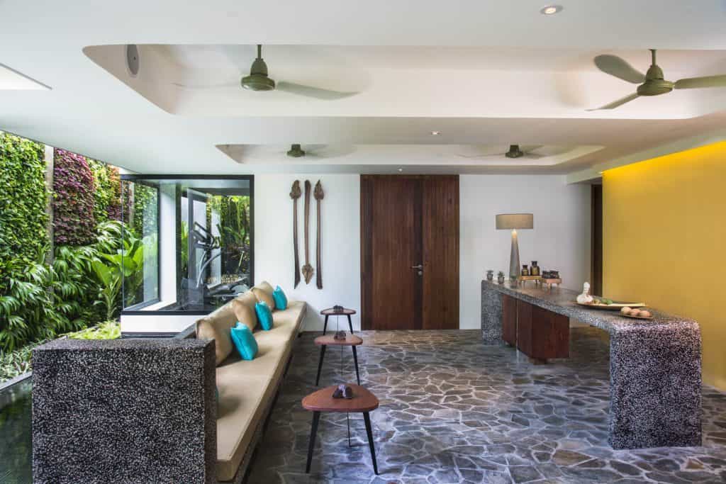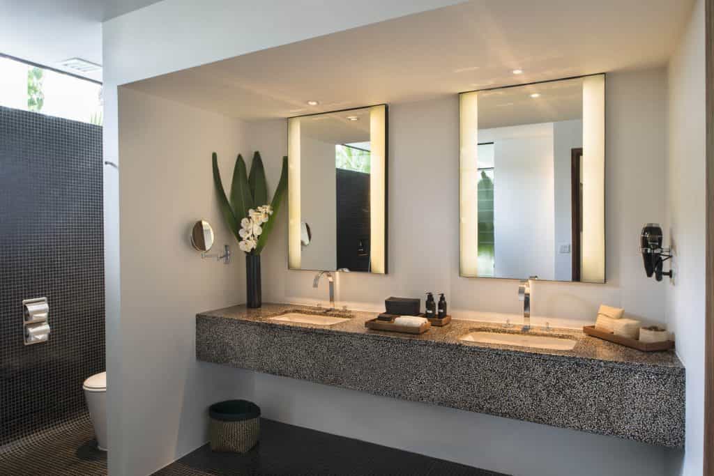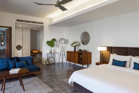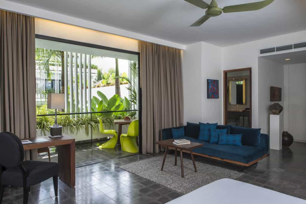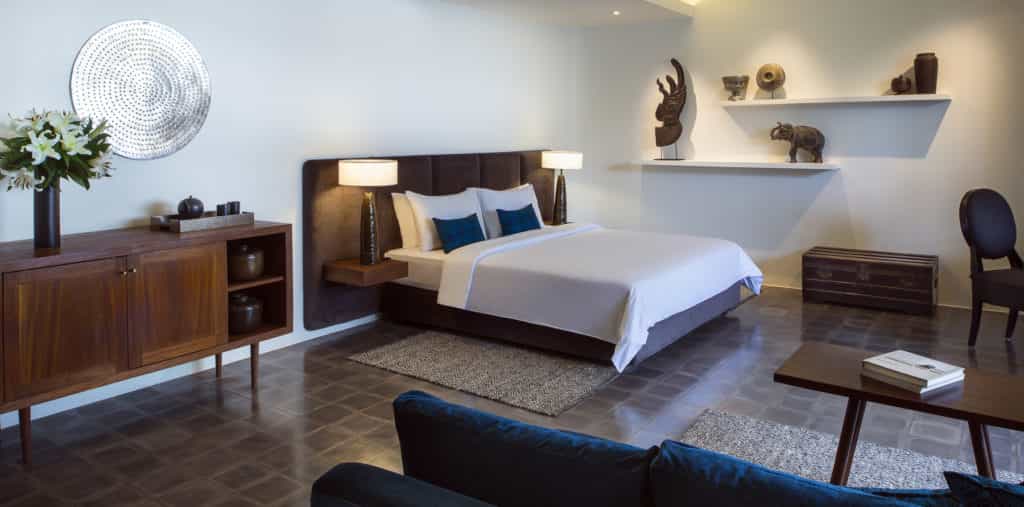 A spiral stone staircase leads to two wings, with a range of light and understated rooms. Smoky black Terrazzo floors give a retro feel and the decor includes carefully-chosen antiques. The large, linen-clad beds are topped with jewel-toned cushions that match the lounge area and each room has a terrace looking out over the gardens or pool. The bathrooms are muted and slick with marble countertops and rain shower, while the suites have a glossy black tub and double sinks.