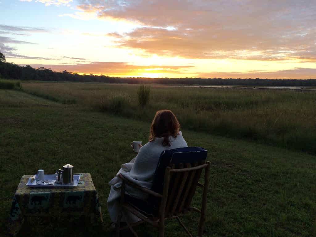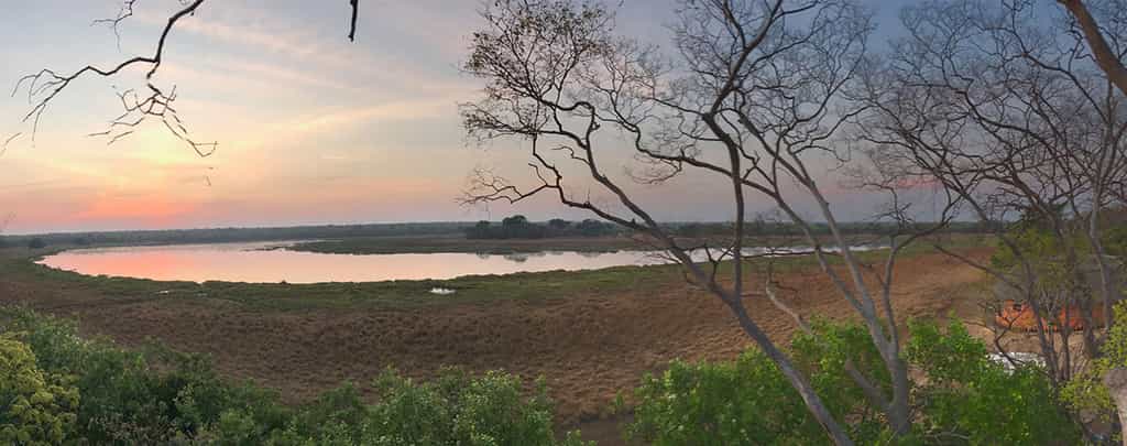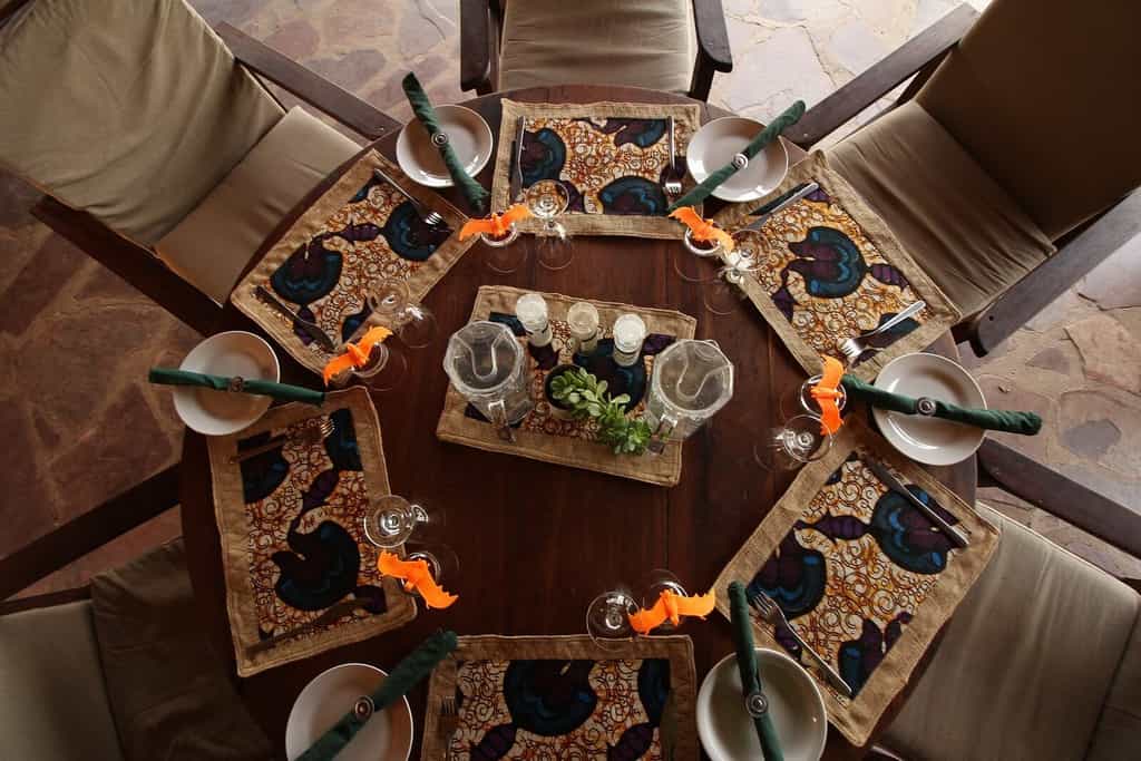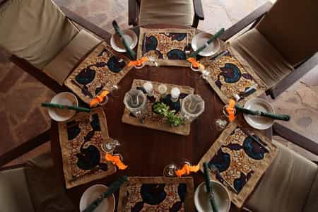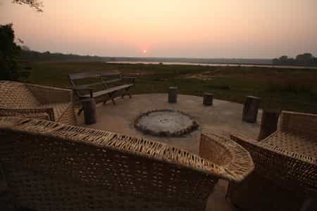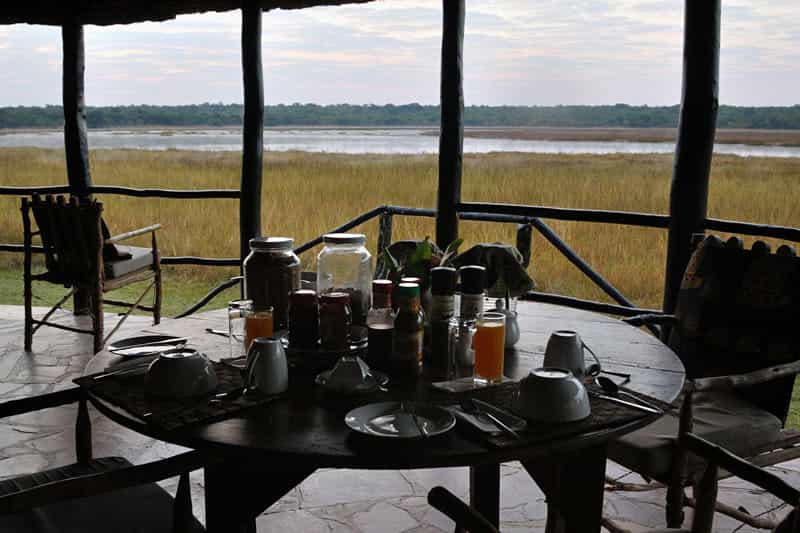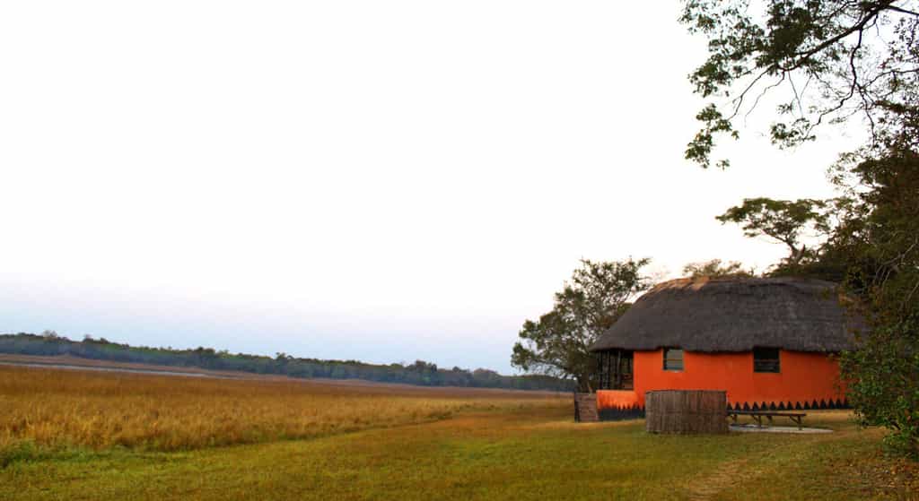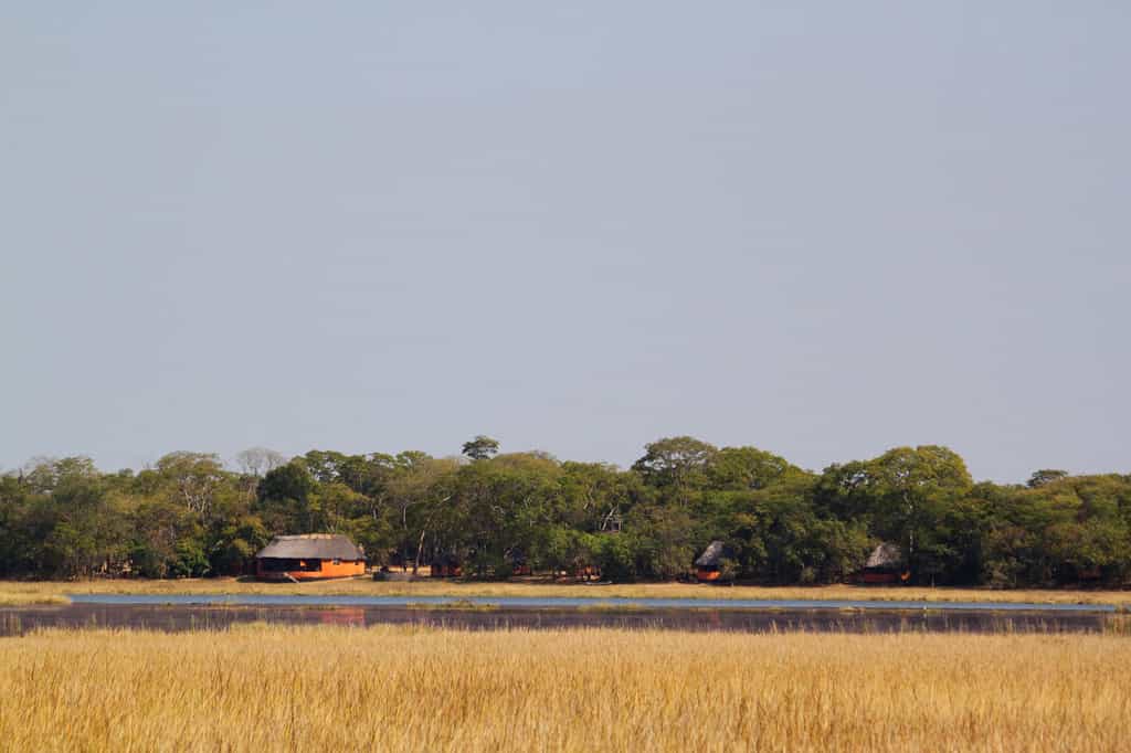 A shallow slope extends from the main area to the bow-shaped lake, its edges thickly belted by reeds. The lodge is set in a mowed clearing that opens to the forest and the free-roaming wildlife. As with all the structures, the dining area is a vivid terracotta orange, topped with thatch and paved with river stones. The elevated veranda has panoramic views of the lake and plains, so you can keep an eye on the bush as you dine.