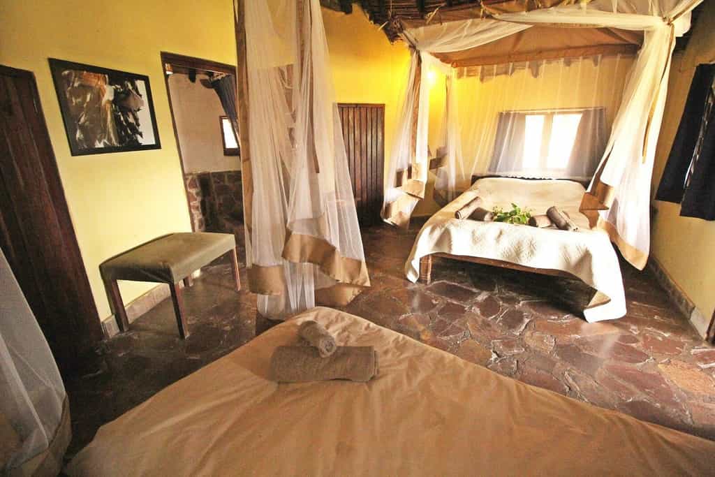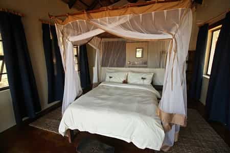 Tucked into the tree line and facing the lake, the seven rondavels (thatched huts) feel both private and part of the wilderness. Three are relatively small units configured with double or twin beds, an en-suite bathroom with flush toilet and bucket shower (heated on request). The larger chalets are suitable for families, with a double and two single beds, en-suite bathrooms with flush toilets and heated showers, and a furnished veranda. Rooms are simple and sparse but tidy and comfortable.