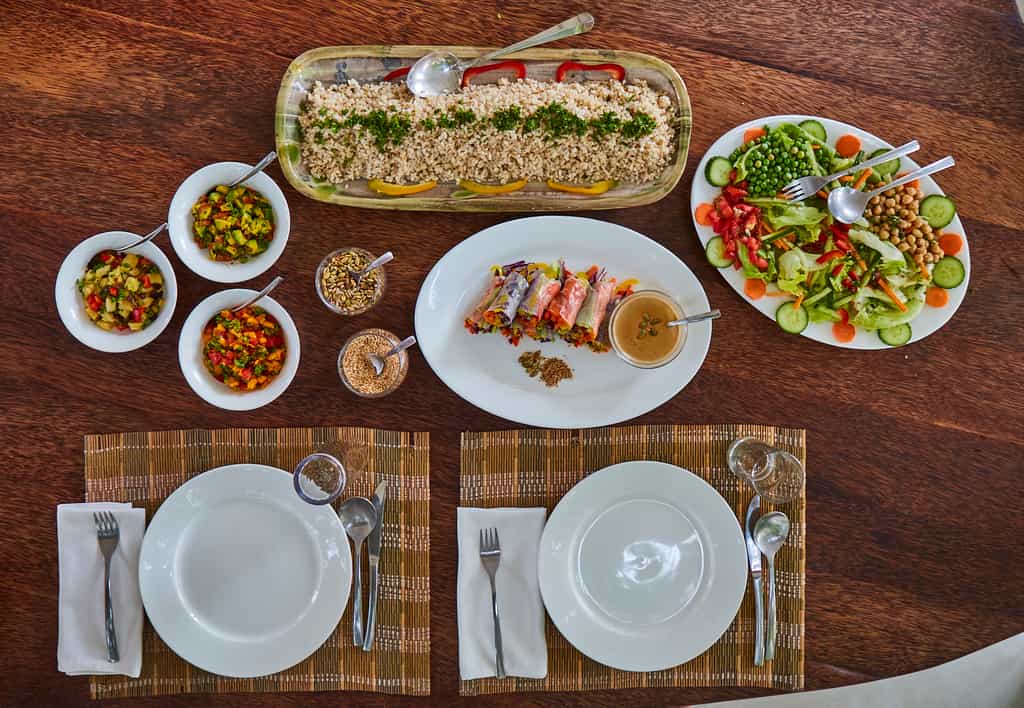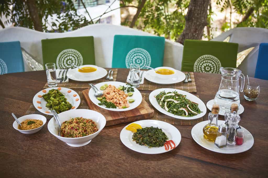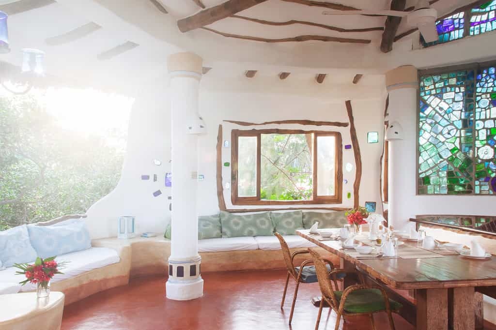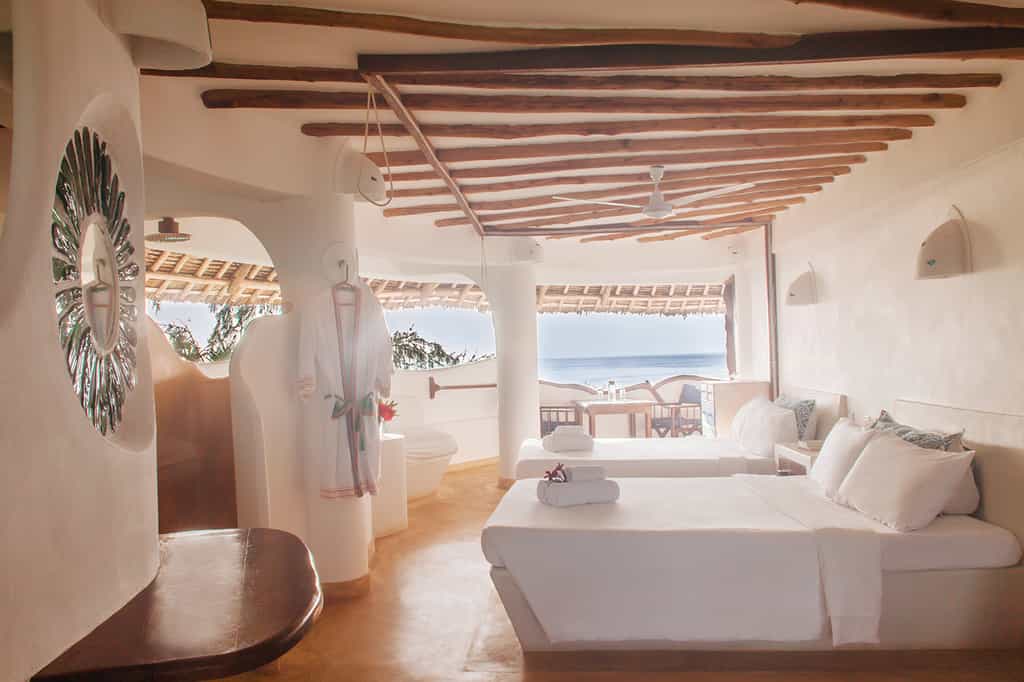 North Tower has three double en-suite bedrooms, each a private balcony, and a romantic star bed up on the rooftop terrace. South Tower has four double rooms with plenty of space for an extra bed, en-suite bathrooms, private dining areas, and balconies overlooking the forest and ocean. Each room has an entirely unique design, with flowing curved walls inlaid with glass mosaics, quirky hand-made wooden furniture, and dreamy ocean-inspired tones creating a tranquil feel high above the forest canopy.