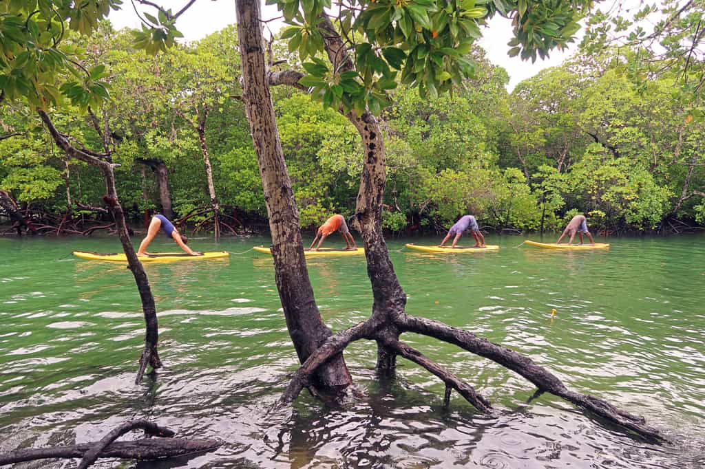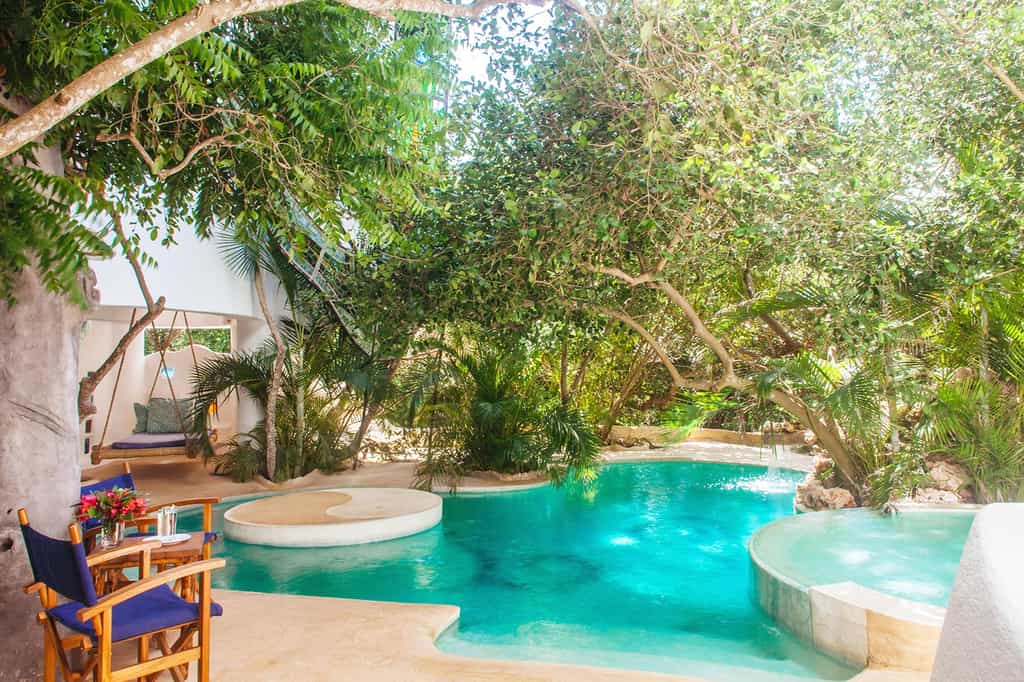 White combines with blues and greens in the two towers that rise above the forest canopy on either side of a beautiful free form swimming pool. Stairways spiral up the outer walls, leading into the cosy living areas and relaxation decks on each level. North Tower has a fully equipped kitchen, a comfortable shared living area, and a fabulous rooftop lounge and yoga studio. South Tower's star attraction is its ground-to-top-floor wall of shimmering turquoise and emerald glass.