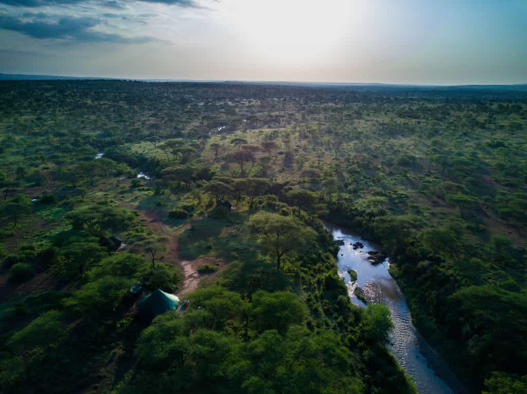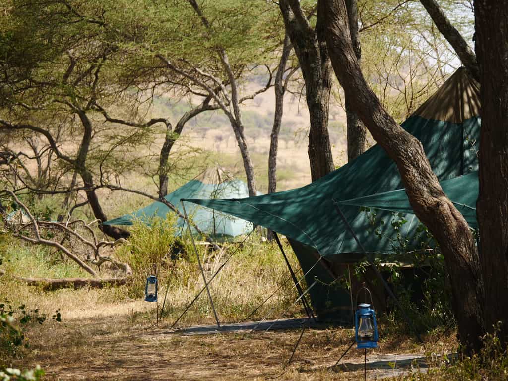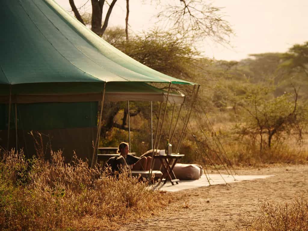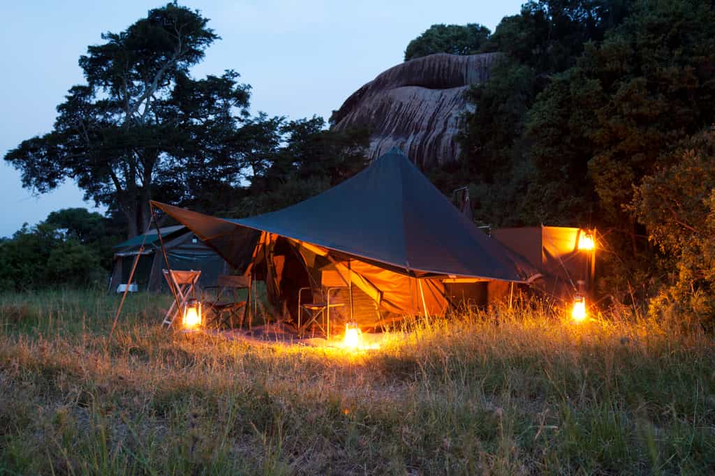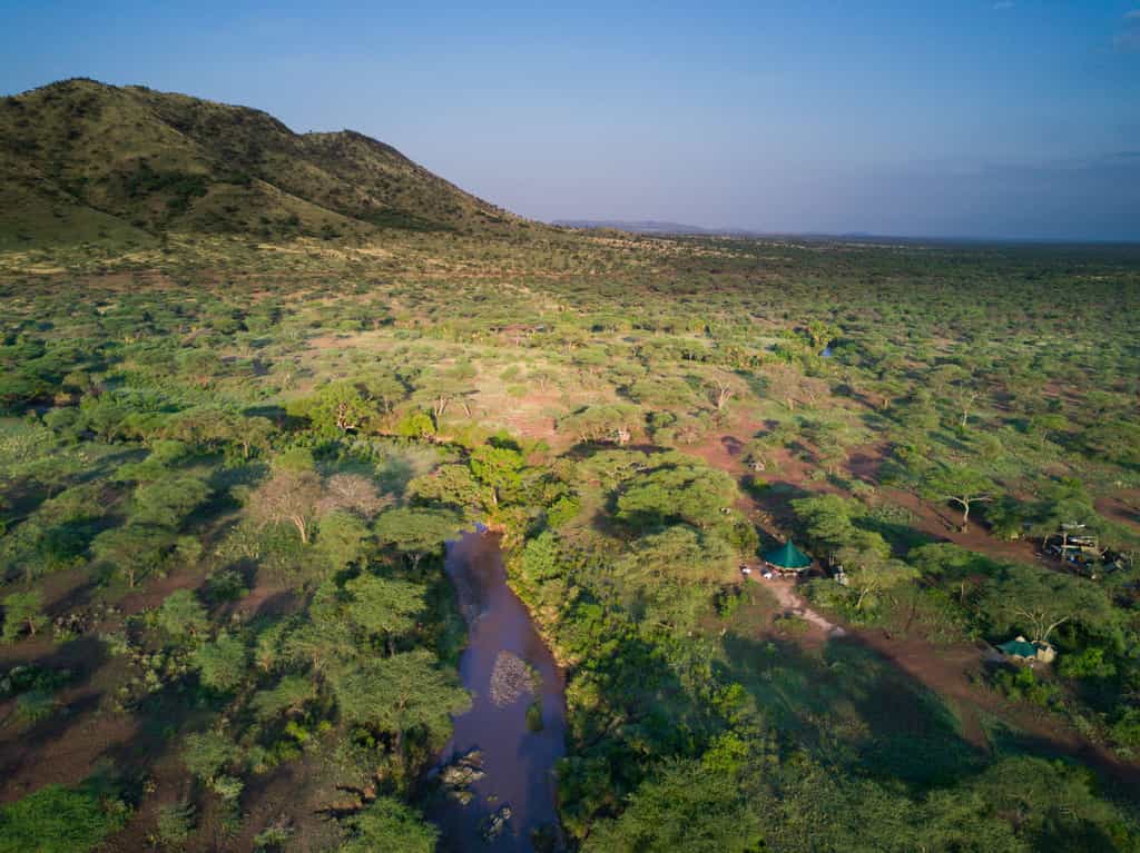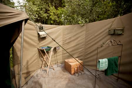 The main area of camp is simple but functional, and there are plenty of comfy sofas and chairs under the tarpaulin shade, positioned perfectly for wildlife-watching across the landscape. Food is simple and hearty, home-cooked by the smiling chefs and served in your private dining area. Congregate at the campfire area in the morning for a pre-dawn cup of tea before the game drive, and again in the evening for drinks and safari tales.
