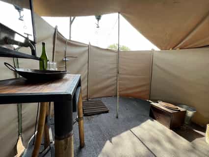 In the far-flung and epic Serengeti, Wayo always finds the remotest of places to set up camp, often getting within a hair's breadth of the Great Migration. After a day's safari, sip sundowners on the riverbank and tuck into hearty meals prepared in the kitchen or over a sizzling fire, the snorts and shuffles of wildlife as your soundtrack. The main tent is a casual space with a bar area built from chunky, wooden crates and lounge furnished with cushioned benches and bean bags.