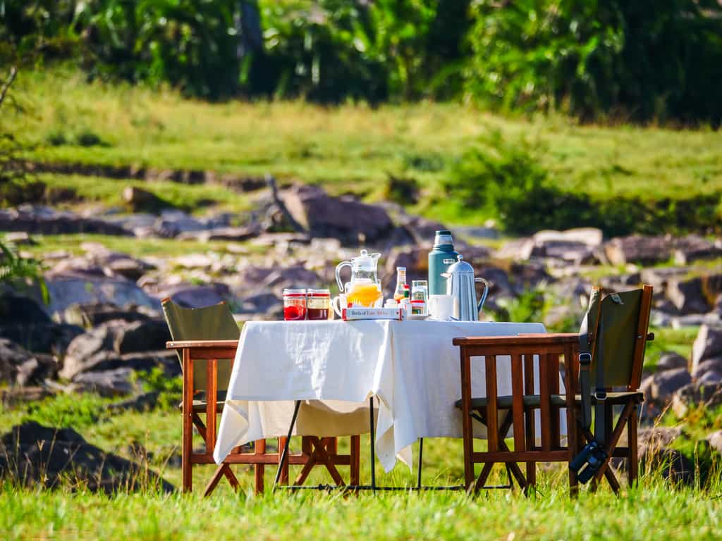 Ten canvas tents are dotted around the savannah, some with river views (do request one!) while others are without. The sides of the tent are all mesh, keeping things cool and breezy and allowing for fantastic 360 degree views. Inside, you'll find simple luxuries like comfy beds, crisp linens, and a classic bucket bush shower to ensure you can relax and wind down after a full day enjoying the wildlife. And for families, there's just enough space to make up a triple if required. A tarp serves as a porch, where you can lounge in a camp chair while enjoying the view.