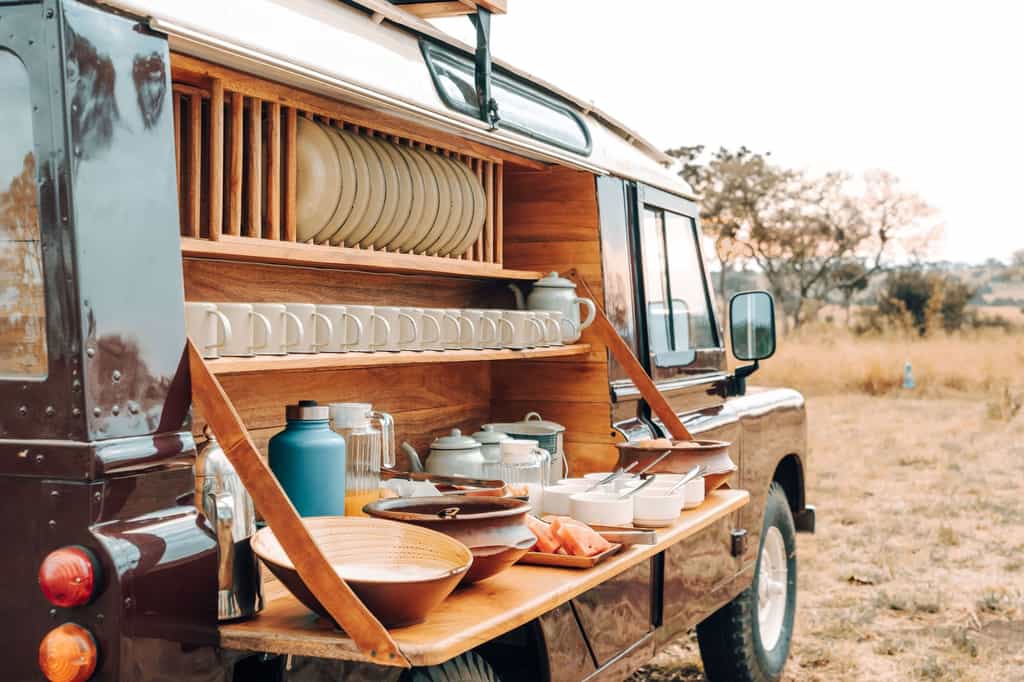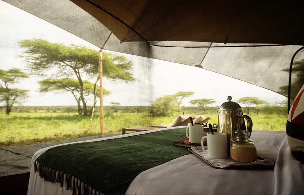 The Serengeti Green Camp comprises 10 square en-suite tents. Each tent can be set up as double, twin or triple for families. With cosy beds, stylish interiors, and outdoor seating to relax on, each tent has been cleverly designed to offer the greatest comfort with minimum impact to the environment. Simple luxuries, comfy beds, crisp linens, and classic bucket bush showers ensure you can relax and wind down after a full day enjoying the wildlife. The central mess tent has lounge chairs and a small library so you can relax in complete comfort during the day.