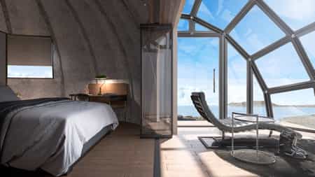 Like egg shells dotted along the granite plateau, the heated bedroom pods have cosy blankets, warm, earthy panels, and ports for charging your camera. Pods all have en-suite washrooms with a basin and loo, and there is a communal ablutions pod with three showers. The bedrooms are simply but elegantly decorated and provide a good night's sleep in the land of 24-hour sunlight. Waking up to a vista of rocky mountains peeking through the clouds and the morning light glistening on the snow is pretty memorable.