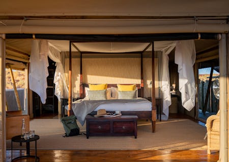 The six tents are raised on wooden decks, each with sensational views of the desert plains and rugged mountains ahead. They are spacious and stylishly furnished with four-poster beds, large dressing tables and ensuite bathrooms. The sizeable front veranda can accommodate your bed if you wish to sleep under the stars, and each also has a ‘Chiller’ - a small, icy plunge pool that offers a glorious respite from the desert heat. Up the dune is the Family Suite, a beautiful two-bedroom two-bathroom villa with its own lounge and private ‘Chillers.’