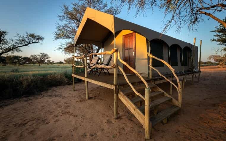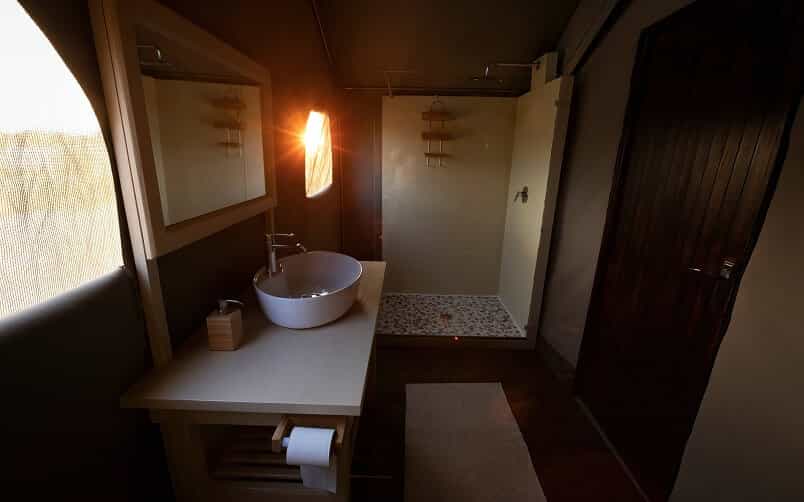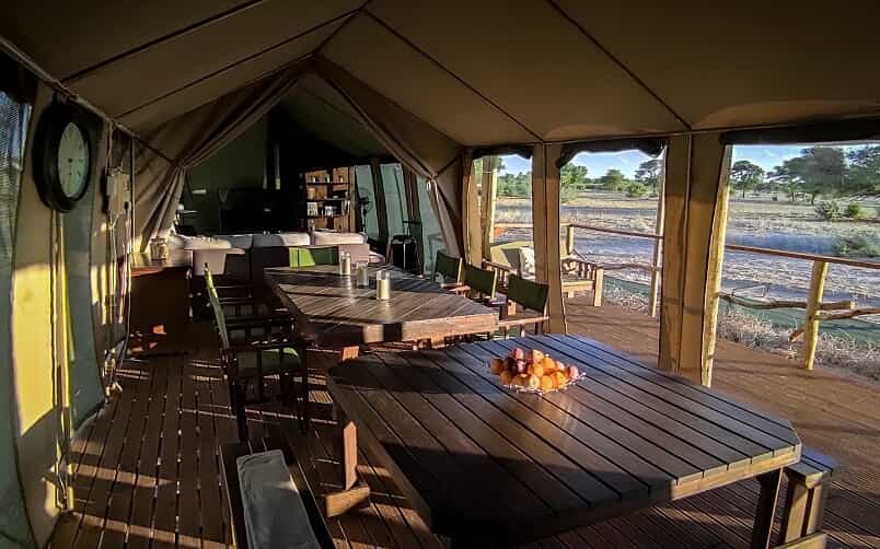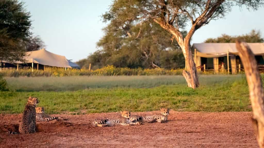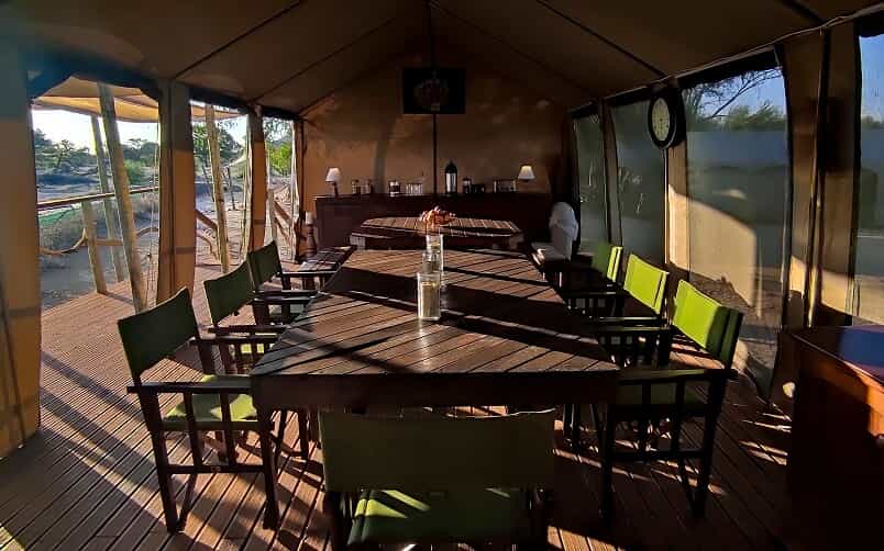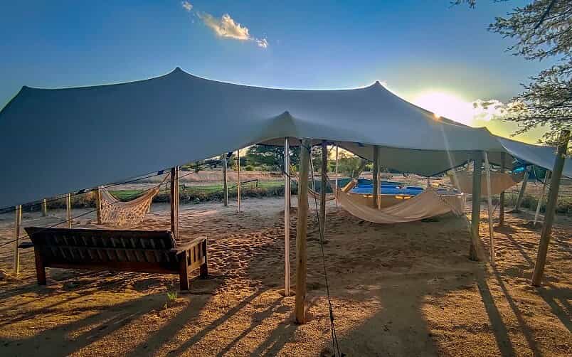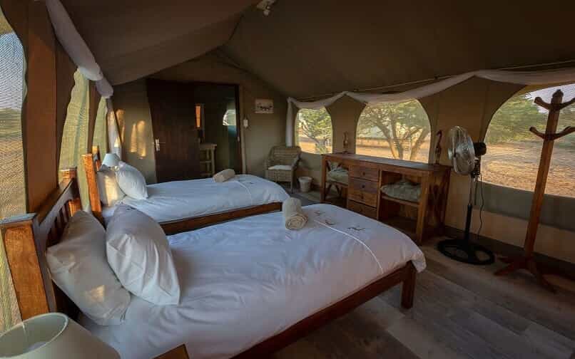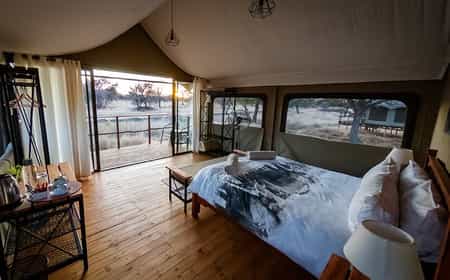 Guests are accommodated in a tented lodge which offers incredible game viewing and sensational star-gazing opportunities to all who visit! There are five two-sleeper tents each with an en-suite bathroom (rooms are shared between guests). There is a kitchen and dining tent, a shaded outdoor section for guests to relax, and a boma for outdoor dining. There is electricity and hot water at the lodge, and safe drinking water is available. Catered and self-catered options are available.