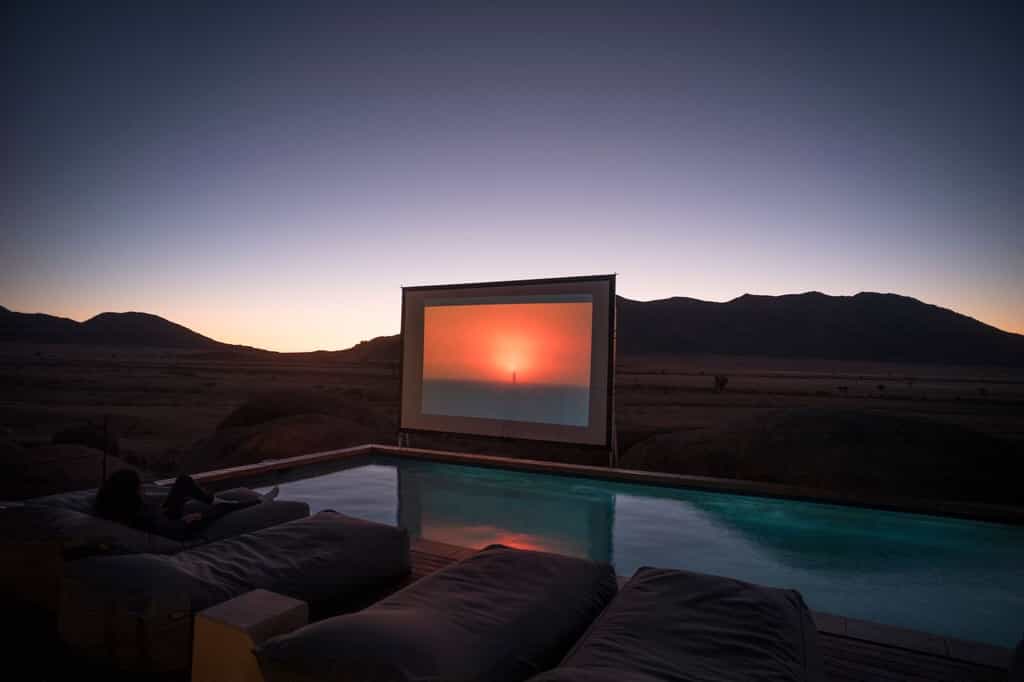The main area is all you'd expect from a lodge of this calibre, with all focus on your comfort, and centre stage given to that stark landscape. The lounge is rich with dark woods, worn leather, Persian rugs, antiquarian books, and intriguing artworks. There's a swish cocktail and cigar lounge, a dining room crowned with a candelabra, a spa and a pool. Topping it all is a romantic open-air desert cinema, the first we've seen.