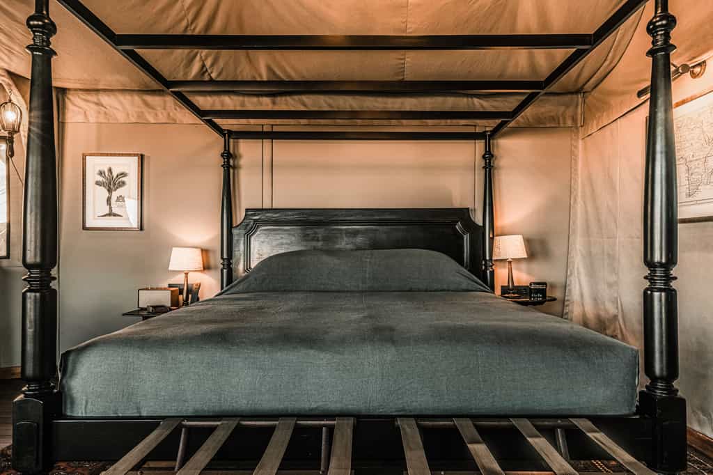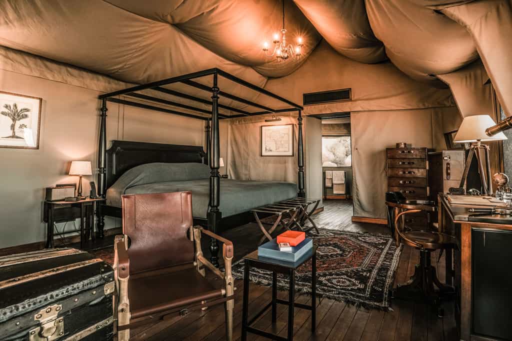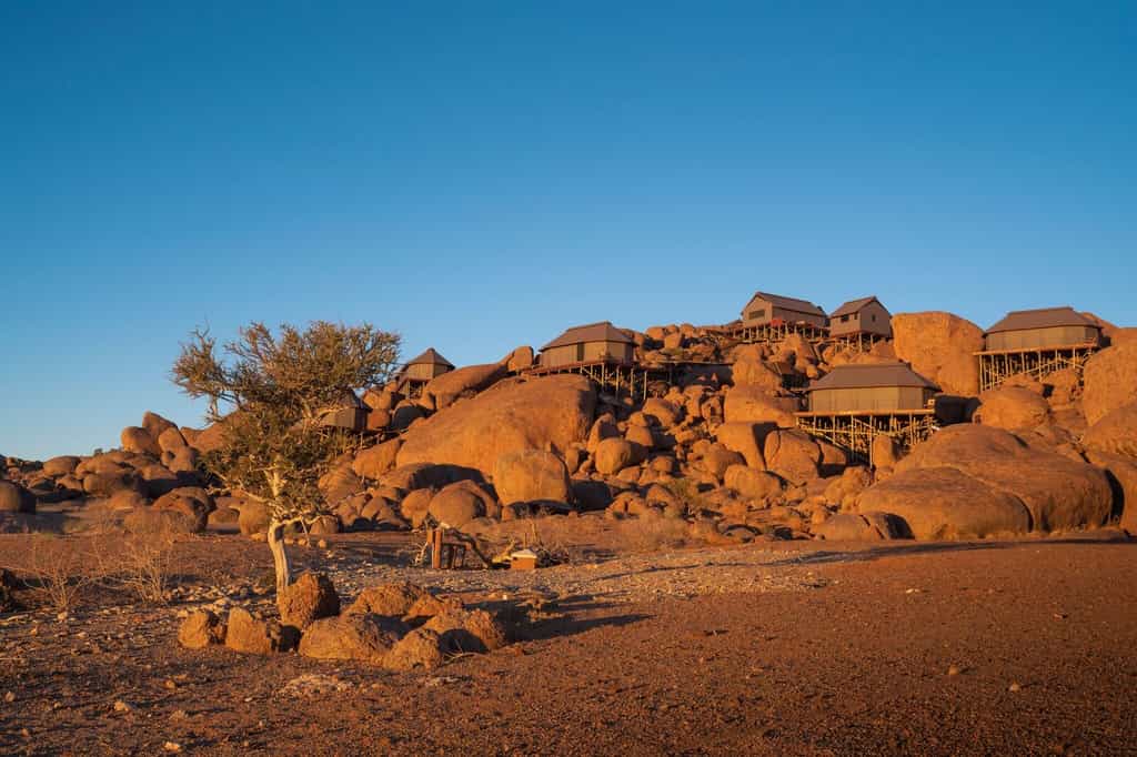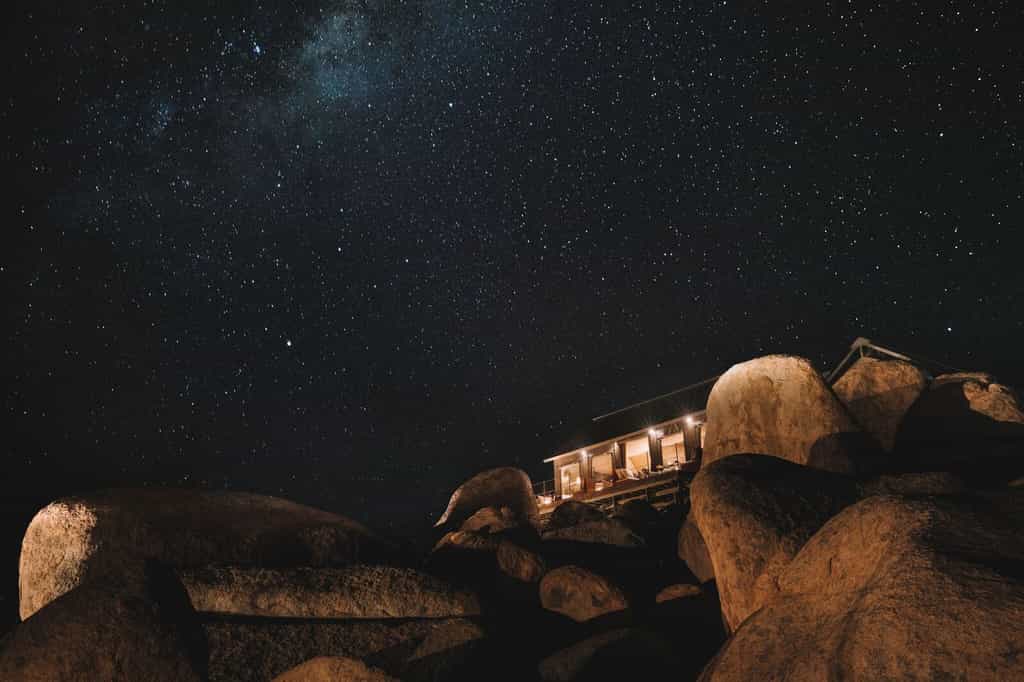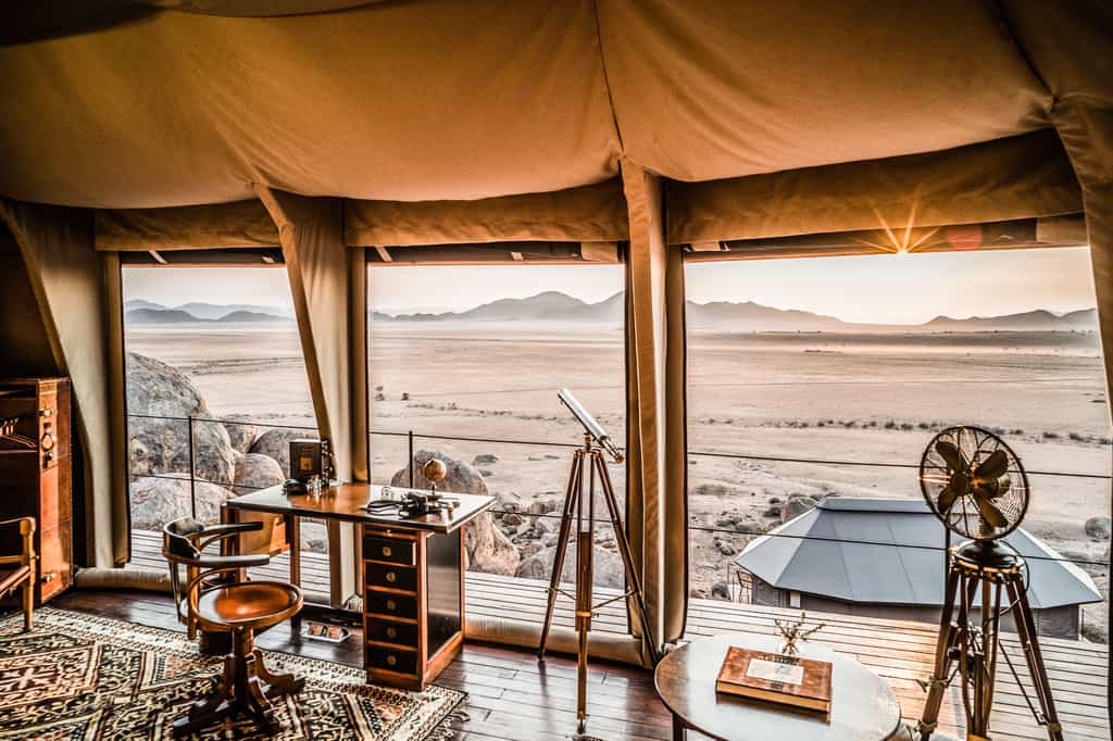 Eight single-room and two double-bedroom tents are set on the boulders, making the most of the views through large mesh windows. Actually, the units are rather more than tents – while the walls are indeed canvas, the interiors combine old-school clocks, a spinning globe, and a telescope with ultra-mod wi-fi, Bluetooth speakers, and electric kettle. Snuggle down in your huge four-poster bed, soak your cares away in your deep copper bath overlooking the desert, and linger on your private deck.