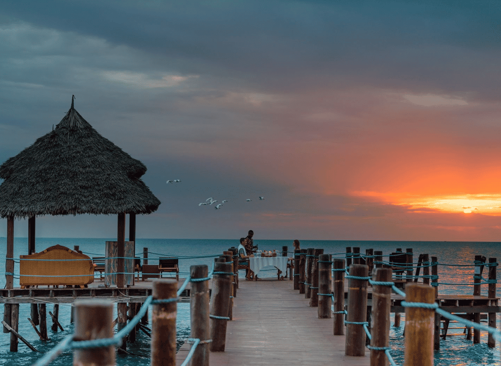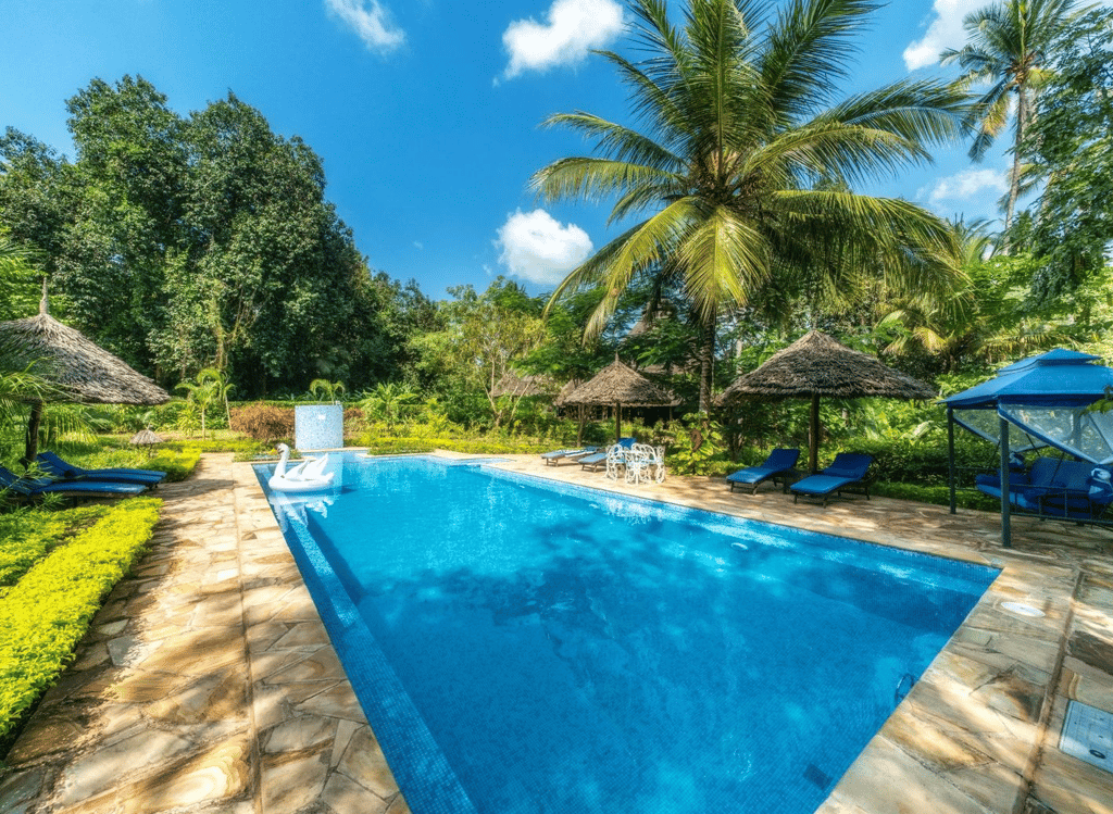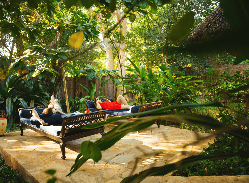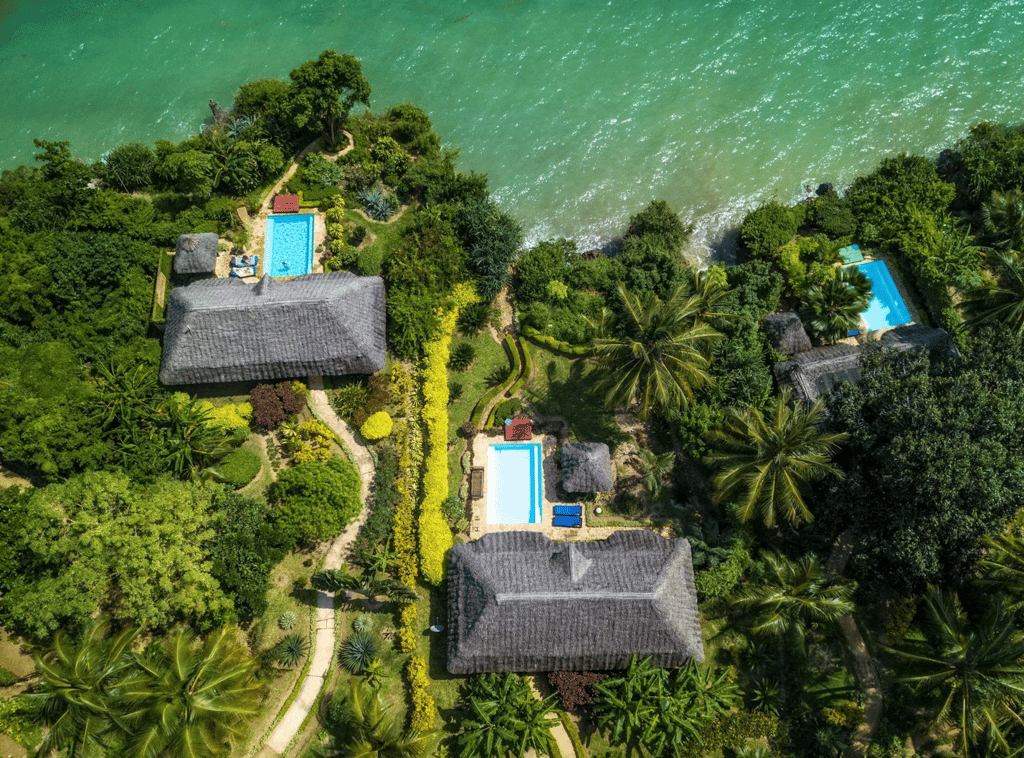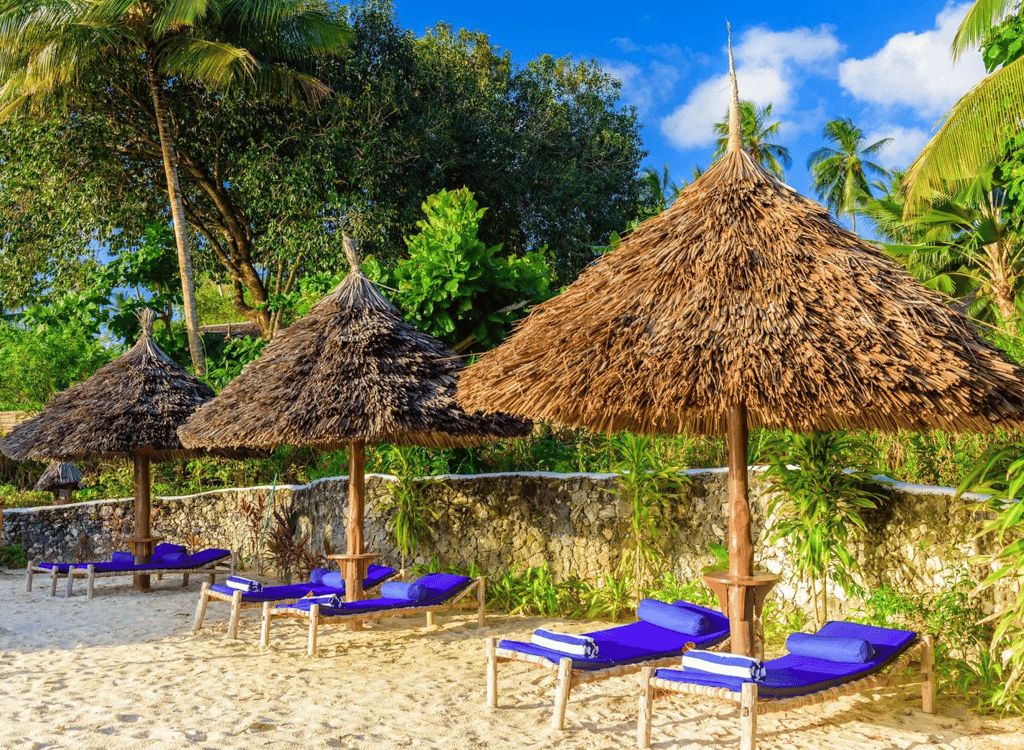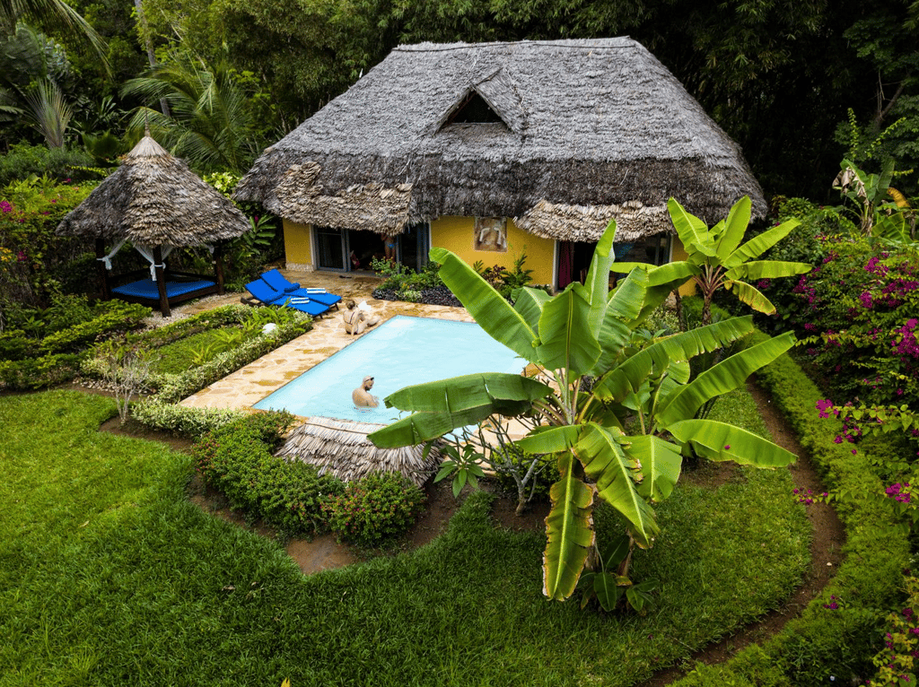 Zanzi Resort sits on the edge of the Indian Ocean, 15 km from the historic Stone Town and 30 minutes from the airport. It's 13 spacious, artistically designed villas and bungalows, offer an intimate environment with patios, some featuring private pools. The resort, spread over 6 hectares of plush tropical gardens, has an excellent in-house restaurant and treatment area, offering oceanside massages and the Japanese hot-stone treatment, gambanyoku. Local cuisine is prepared for an international palate with fresh seafood, organic vegetables, and spices from our own eco-plantation. Guests can dine in the restaurant, in the privacy of their villa or bungalow, or on the beach.
