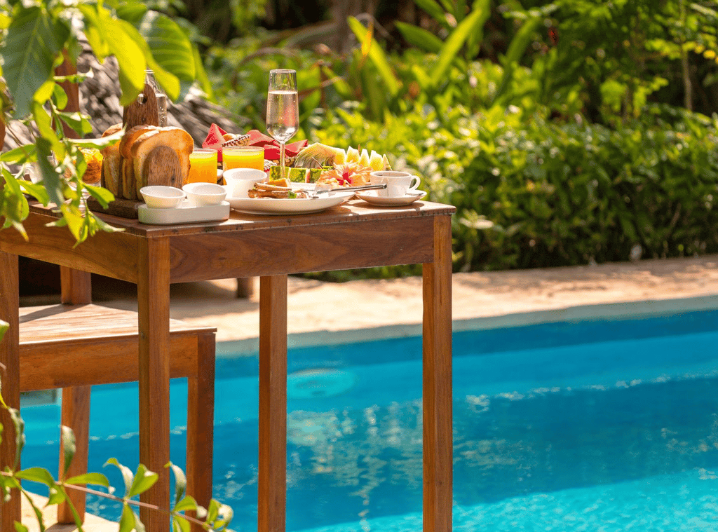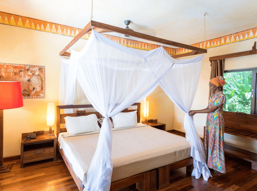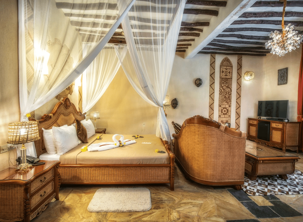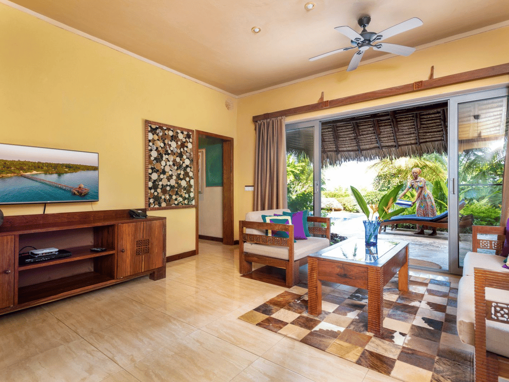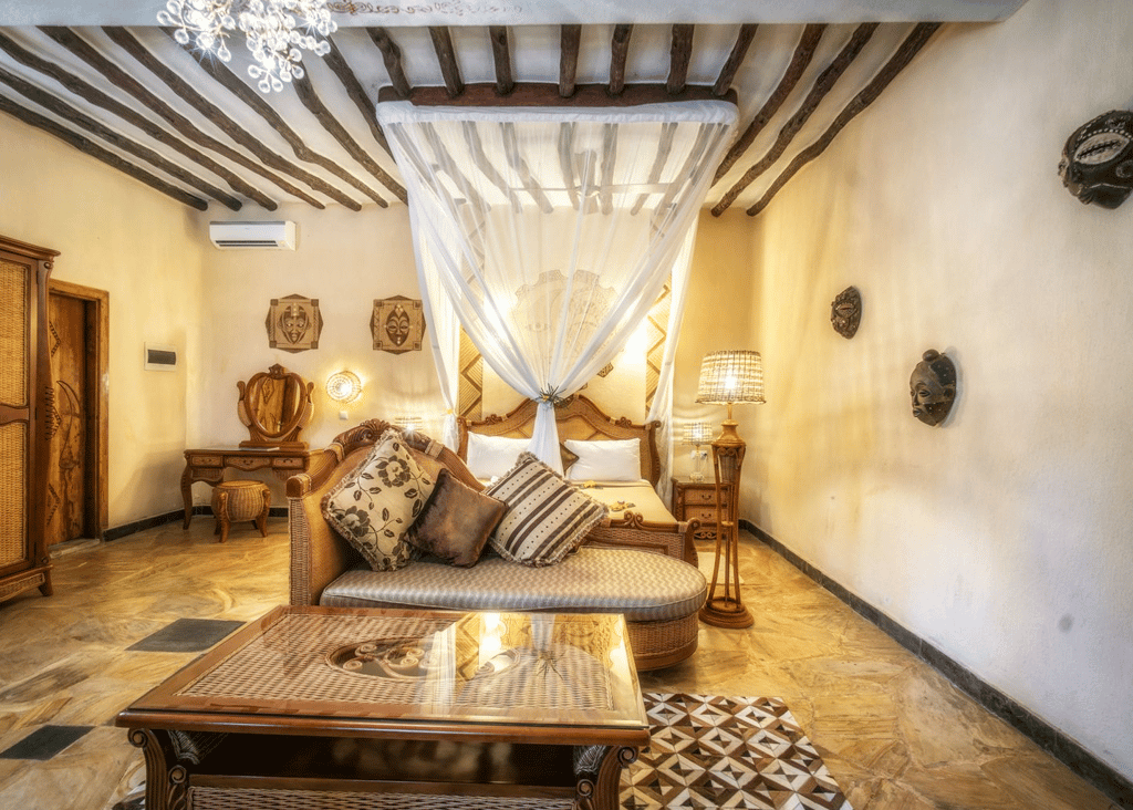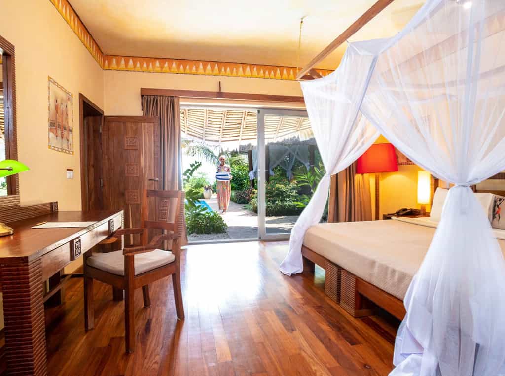 Zanzi Resort sits on the edge of the Indian Ocean, 15 km from the historic Stone Town and 30 minutes from the airport. It's 13 spacious, artistically designed villas and bungalows, offer an intimate environment with patios, some featuring private pools. The resort, spread over 6 hectares of plush tropical gardens, has an excellent in-house restaurant and treatment area, offering oceanside massages and the Japanese hot-stone treatment, gambanyoku. Local cuisine is prepared for an international palate with fresh seafood, organic vegetables, and spices from our own eco-plantation. Guests can dine in the restaurant, in the privacy of their villa or bungalow, or on the beach.