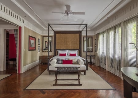 Surrounded by courtyards with grand wooden doors, the 19th-century teak residence sits in a garden filled with birds of paradise flowers. Inside is Jack Bain's Bar, built in the style of an old-school lounge complete with purple velvet chairs and a whisky-forward menu (with cocktails thrown in too). Enjoy Thai staples at The Dining Room plus a buffet breakfast of crab meat omelettes or buttermilk quinoa pancakes; and head to Palette for a more continental selection. Take your Afternoon Tea on the elegant, robin's egg blue sofas of The Parlor or out on the immaculate lawns. Indulge in a sandalwood wrap or an Indian head massage at the spa, or simply enjoy the 35m pool in a hidden, vine-clad corner of the garden.