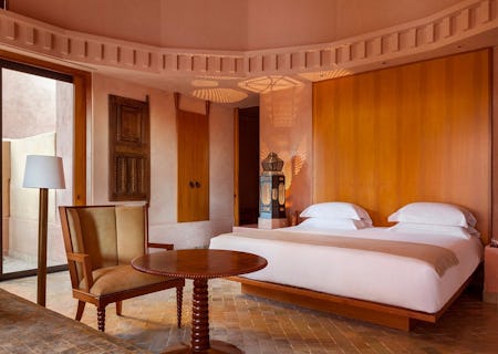 Accommodation is split between pavilions and two-storey maisons. Done in Amanjena's quintessential pink, the rooms have high ceilings, bright interiors, and authentic candle lanterns, and all en-suites have enviable, Ouarzazate marble bathtubs. Pavilions have a private garden with a dining gazebo, whilst some also have a large heated pool. Looking over the palm groves and High Atlas Mountains, the maisons are exceedingly lush with amenities that range between a private pool and outdoor fireplace to a 24/7 host and private bar.