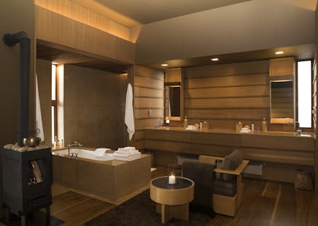 Minimalist but not lacking in any comfort, the hotel has just eight suites with tall cathedral windows and a demure day bed. Warmed by wood-burning stoves with woven baskets containing extra logs, the suites are furnished with king-size beds in white linens, quirky lamps and a small lounge area - but no mini bar or TV. The en-suite bathrooms are lovely with a deep tub lined with terrazzo, rain shower, double basins and a spacious, walk-in closet.
