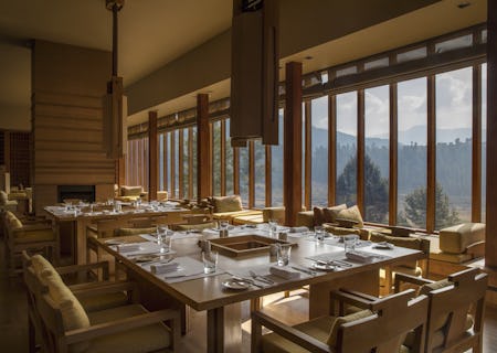 Large, family-style tables are at the centre of the dining room, which takes full advantage of the view with a wall of windows. Enjoy candlelit dinners of Bhutanese classics, as well as more continental fare, paired with house wines. In little farm houses with bamboo doors that open to reveal the valley, you'll find two massage rooms and a hot stone bath for an extra dash of relaxation. Decorated in shades of yellow and cream, the lounge is a great place to tuck into a book or enjoy a cup of tea.