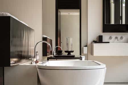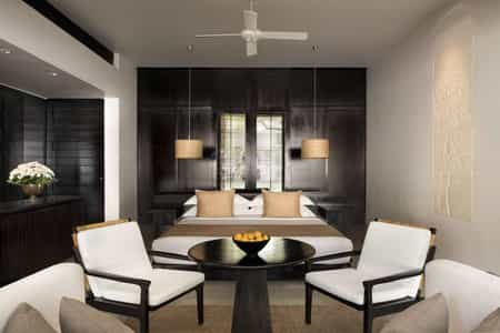 Softly finished with pale terrazzo and timber, the open-plan suites have polished, retro furnishings including a pillowy bed, writing desk and lounge. Expansive glass doors lead into a sunny courtyard decorated with ornate carvings and cushioned spots to recline - and some have a private pool. The bathrooms are in-suite (the toilet and rain shower are separate) with a superb island bath and slick, black vanities. The air-conditioned suites are well-stocked with a sound system, mini bar and a daily supply of fruits, cheese and freshly-baked treats.