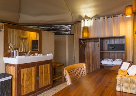 4 tents are raised on stilts and connected to the main area by a network of elevated walkways, allowing 4-legged visitors to pass by (mostly!) undetected. The rooms are simple and rustic but with every creature comfort you could wish for and, we think, rather stylish with vast beds, hand-woven rugs and snug armchairs. The en-suite bathrooms are covered but there’s an outdoor shower with a view to complete the glamping experience.