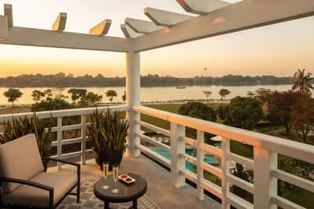 Opening onto wide balconies with a view of the garden or river, the rooms are designed in a re-imagined Art Deco style and muted tones. The bathrooms are cool and bright with tall mirrors, a mosaiced shower and marble countertops. The suites are scattered between the mansion and the wings, and have a snug lounge decorated in shades of cream and light drapes. The Resident Suite plays the role of penthouse with 360° views from the patio and a splash of colourful decor.