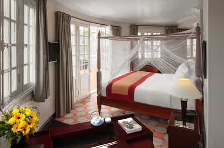 Set in the mansion wing, the restaurant La Parfum is decorated with black-and-white portraits and tiny vases of flowers, and serves a broad menu of Vietnamese cuisine. Breakfast is a joint affair with a buffet of noodles, fried vegetables, European pastries and omelettes. Le Gouverneur bar is artfully designed in silky peach-coloured drapes and antiques, with a selection of cocktails, liqueurs and local brews. Enjoy a proper pamper at the spa with everything from Vietnamese cupping to herbal massages using locally-grown ingredients.
