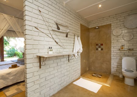 Central to this intimate guest house is a rambling, high-ceilinged thatched structure, home to the Caldecott Dining Boma and the Ingwezi Tavern; here tasty fare is served, cold brews are a-plenty and the atmosphere is buzzing. Just outside is the central patio area with a delightful teardrop swimming pool, oodles of shade and comfy garden seating. There's an outdoor dining area too, a barbecue and fireside seating - the perfect place to recount the day's adventures.