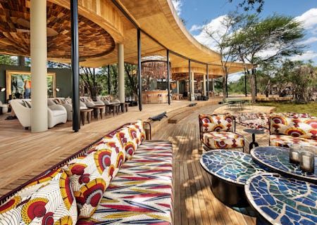 The main lodge comprises several well-considered areas inspired by the curve of the river and traditional Maasai manyattas: a spacious open-plan lounge adorned with Kitenge fabrics and bespoke furnishings; an artfully-designed circular bar and lovely infinity pool overlooking the river. Expansive breakfasts are a true guest favourite, most lunches are served on the shaded wooden deck and why not join the chefs in the interactive kitchen? The camp also has one of the nicest boma areas around, serving artisanal pizzas, whole-baked fish (and more) around a central fireplace, at private tables with soft sand underfoot.