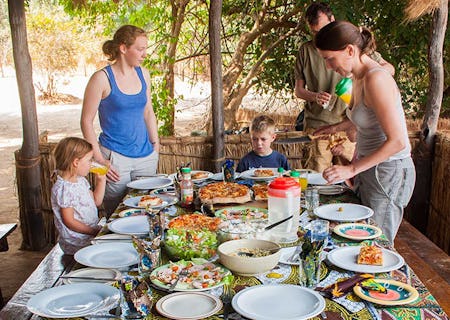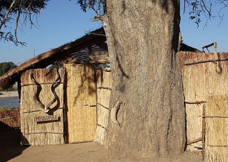 The main guest area is tucked away beneath a stand of magnificent riverine trees, with an open-plan dining space and bar area enclosed by low reed walls overlooking the water. There's a thatched section in case of the occasional thunderstorm, and a central fire pit. Meals are fairly simple due to the camp’s remote location, however they are delicious and made all the more special in this magical setting, where wildlife can be spotted coming down to drink.