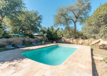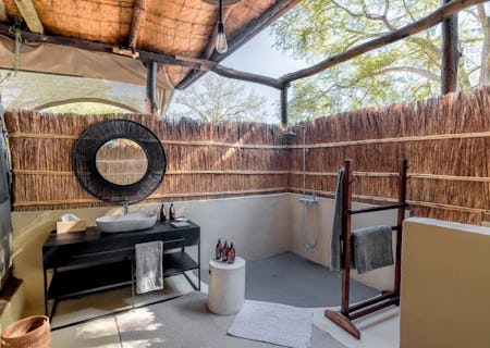 A large canvas roof suspended from the trees houses a bar and chill-out area, the perfect spot from which to watch the constant procession of animals around (and in!) camp. Down on the water’s edge, traditional safari chairs surround the fireplace where guests congregate in the evening before eating al fresco under the glittering stars.