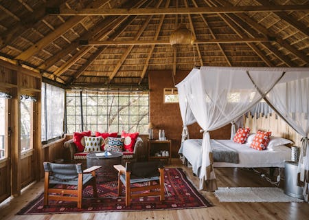 Hidden among the riverbank trees are five thatched chalets, their interiors creating the sense of an elaborate hide perched on stilts. Extremely spacious with one open-sided wall overlooking the river, each chalet has a large, net-draped four-poster bed and a lovely seating area. The en-suite bathrooms have showers and/or a shower and bath. For families, Chundu Cottage is a stand-alone unit that sleeps up to seven people, with its own lounge and pool and, if desired, dedicated staff.