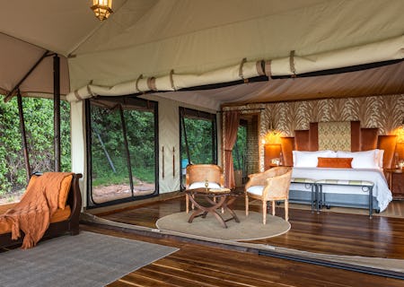 The camp has 15 cream canvas tents in total (three lovely honeymoon tents, five double tents and seven family suites), all redolent of the 1920s with romantic mosquito-netted beds, en-suite bathrooms and, for your comfort, other mod cons. The family tents have living rooms with fireplaces. All the tents are private and quiet, suiting everyone from honeymooners to families with young children. Nearby, private Cottar’s Bush Villa has its own long swimming pool.