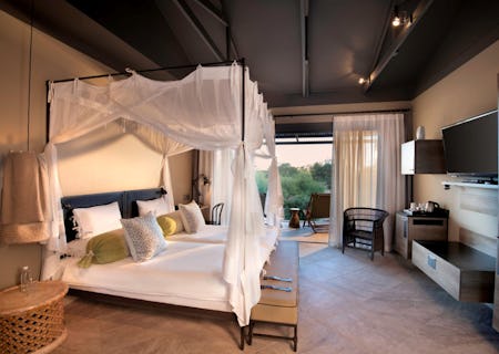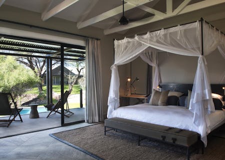 The rooms, which accommodate a total of just 20 guests, are decorated in contemporary yet classic African-style, with modern neutral shades of whites, browns and light grey. Each room has its own terrace furnished with directors' chairs and loungers perfectly positioned to view the game, and the gardens or the bushveld. All are air-conditioned, with en-suite bathrooms, minibars, satellite TV and safes. The river- and waterhole-side suites are larger in size and have additional lounge areas.