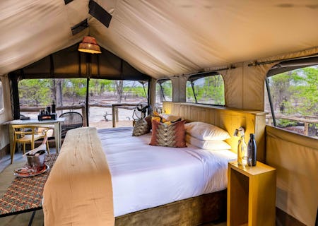 The guest area sits on an elevated platform, with an open-sided dining room, bar and comfortable lounge under a high thatched roof. A wooden walkway sweeps along the front of the lodge to a sun trap deck and the all-important fire pit, and the rim flow swimming pool looks directly across the waterhole, for a spot of wildlife-watching as you float. The camp is unfenced and completely open to the bush – elephants are frequent visitors, so be prepared for some close encounters!