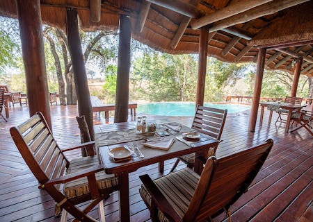 The waterhole visible from the dining deck – guests have nicknamed it 'Elephant TV'. Herds wander down to drink while you tuck into lunch, and if you're lucky, a leopard might make an appearance after dark.