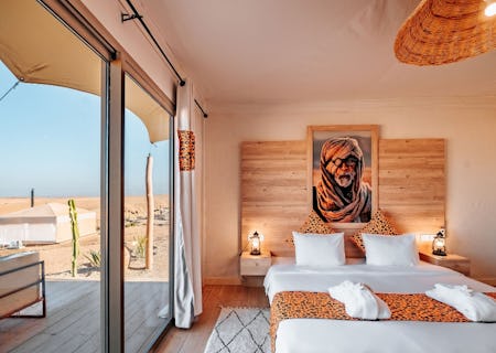 There are 18 tented suites, all draped in sand-coloured canvas and varying in size and style. All boast a King-size bed, cosy, woven rugs and a bathroom equipped with hot water and orange blossom amenities by Les Sens de Marrakech. The decor is down-to-earth and most items are sourced from local artisans, as well as vintage trunks and lots of bare-wood furnishings. The Emotion tents and Inara Suites have an air cooler, and the latter can accommodate up to four people. Each tent opens onto a private deck, from which you'll enjoy a striking view.