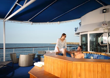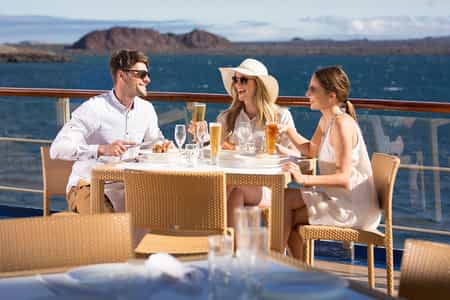 The work of Ecuadorian designer, Diego Arteta, the interiors are a blend of steel and light wood. Throughout the yacht, you'll find screens with the day's itinerary and the naturalist guides share their expertise in fascinating presentations. There's also a well-stocked library for some reading of your own. In the elegant dining room, gourmet dishes are prepared by a Cordon Bleu-trained chefs and lunches can be enjoyed at the Al Fresco Bar, along with delicious cocktails. On the sun deck, there's plenty of loungers to go around and lovely hot tub.