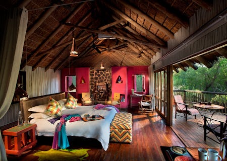 Jaci’s Tree Lodge provides accommodation in 8 luxurious rooms built on wooden stilts and joined by suspended wooden walkways. The thatched, wooden tree-houses overlook the Marico River and blend in with their surroundings, allowing guests to connect with the nature around them. The rooms are decorated in vibrant reds and greens, complemented by African elements, and boast an outdoor shower, a stone bath, heating and air conditioning. Wooden balconies extend into the wide open forest from each of the rooms.