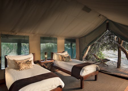 The six elegant Meru-style tents scattered around the permanent waterhole offer plenty of privacy and good views to go around. They are elevated with 360 degrees of mesh windows, ensuite bathrooms and private, outdoor showers. The family room can comfortably accommodate four, with its own dining area and a large wrap-around deck. Furthest from the main area, the stylish honeymoon suite has a free-standing bath in a private annexe and its own dining area as well.