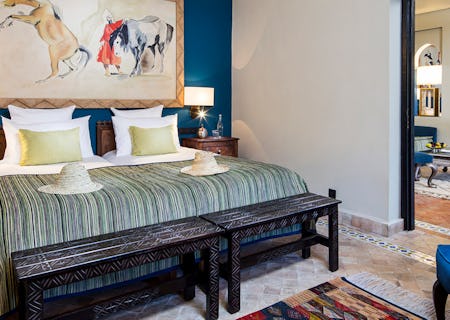 To put it plainly, the rooms are gorgeous. Ornate antiques and glossy silks, velvet couches, and generous paintings under mosaic ceilings fill the rooms with colour. Handmade for the hotel, the King-sized beds are cushy and wonderful, and most rooms have a lounge area and terrace. The suites are stunning with grand arches, plush furnishings and a fireplace. Further down the garden, the Master Suite is a mini kasbah with three bedrooms, huge Moroccan bathtubs, a private pool and rooftop terrace. Kasbah Tamadot also has six luxury riads.